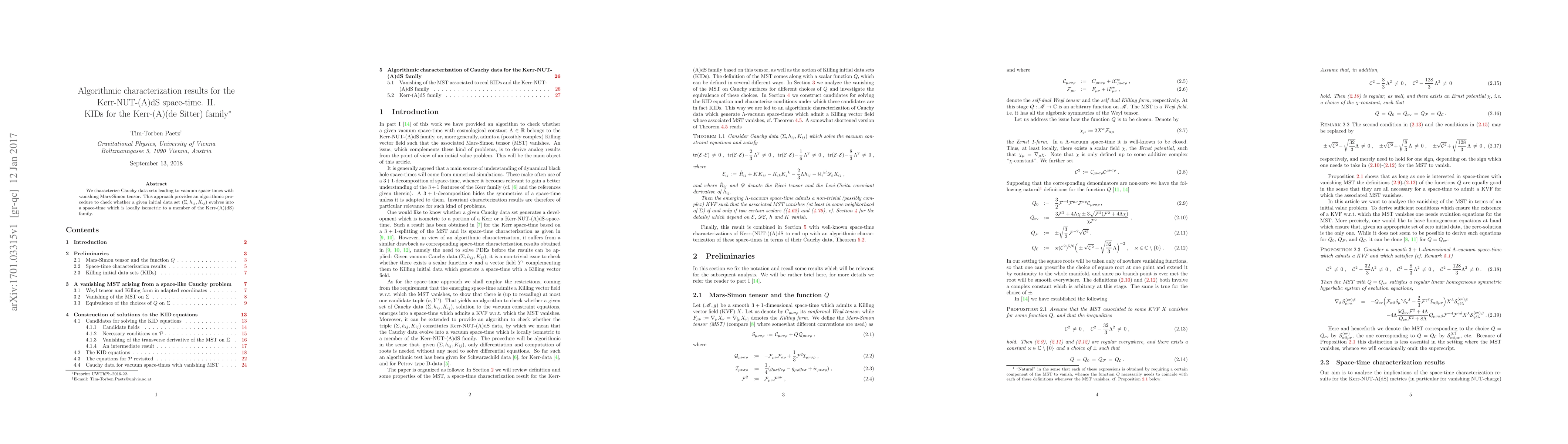 This paper presents an algorithmic method to determine if a given initial data set evolves into a space-time locally isometric to the Kerr-(A)(dS) family, focusing on vacuum space-times with a vanishing Mars-Simon tensor. The approach characterizes the Cauchy data sets for these space-times.
