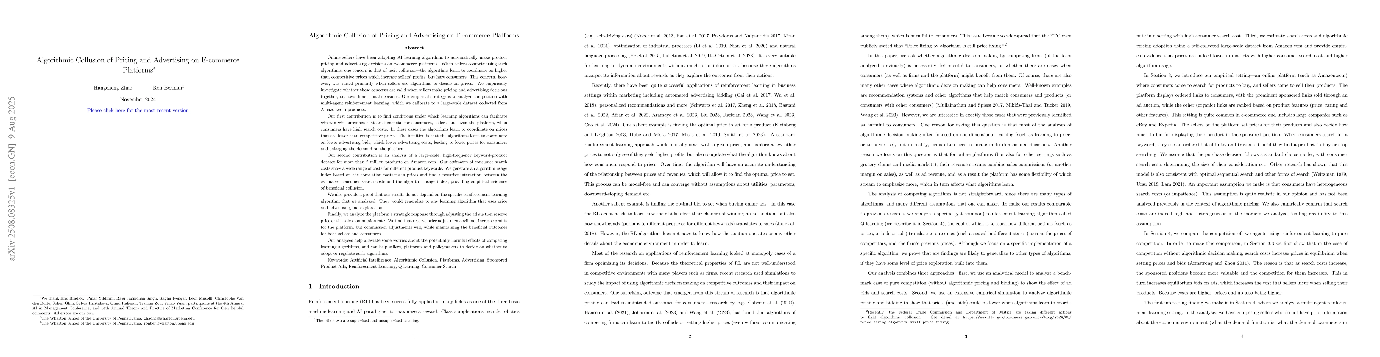 Online sellers have been adopting AI learning algorithms to automatically make product pricing and advertising decisions on e-commerce platforms. When sellers compete using such algorithms, one concern is that of tacit collusion - the algorithms learn to coordinate on higher than competitive. We empirically investigate whether these concerns are valid when sellers make pricing and advertising decisions together, i.e., two-dimensional decisions. Our empirical strategy is to analyze competition with multi-agent reinforcement learning, which we calibrate to a large-scale dataset collected from Amazon.com products. Our first contribution is to find conditions under which learning algorithms can facilitate win-win-win outcomes that are beneficial for consumers, sellers, and even the platform, when consumers have high search costs. In these cases the algorithms learn to coordinate on prices that are lower than competitive prices. The intuition is that the algorithms learn to coordinate on lower advertising bids, which lower advertising costs, leading to lower prices. Our second contribution is an analysis of a large-scale, high-frequency keyword-product dataset for more than 2 million products on Amazon.com. Our estimates of consumer search costs show a wide range of costs for different product keywords. We generate an algorithm usage and find a negative interaction between the estimated consumer search costs and the algorithm usage index, providing empirical evidence of beneficial collusion. Finally, we analyze the platform's strategic response. We find that reserve price adjustments will not increase profits for the platform, but commission adjustments will. Our analyses help alleviate some worries about the potentially harmful effects of competing learning algorithms, and can help sellers, platforms and policymakers to decide on whether to adopt or regulate such algorithms.