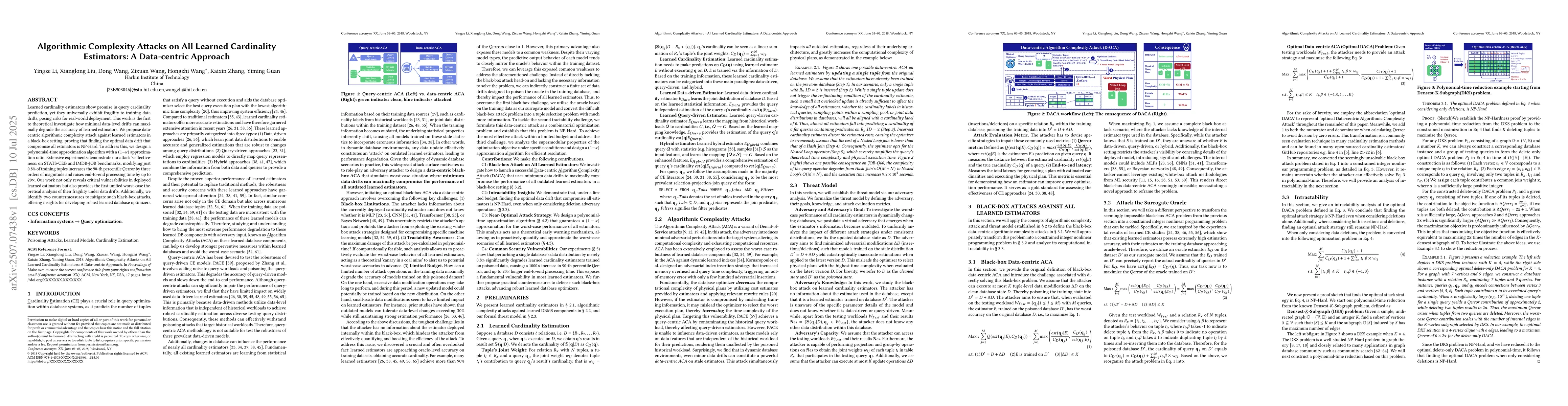 Learned cardinality estimators show promise in query cardinality prediction, yet they universally exhibit fragility to training data drifts, posing risks for real-world deployment. This work is the first to theoretical investigate how minimal data-level drifts can maximally degrade the accuracy of learned estimators. We propose data-centric algorithmic complexity attacks against learned estimators in a black-box setting, proving that finding the optimal attack strategy is NP-Hard. To address this, we design a polynomial-time approximation algorithm with a $(1-\kappa)$ approximation ratio. Extensive experiments demonstrate our attack's effectiveness: on STATS-CEB and IMDB-JOB benchmarks, modifying just 0.8\% of training tuples increases the 90th percentile Qerror by three orders of magnitude and raises end-to-end processing time by up to 20$\times$. Our work not only reveals critical vulnerabilities in deployed learned estimators but also provides the first unified worst-case theoretical analysis of their fragility under data updates. Additionally, we identify two countermeasures to mitigate such black-box attacks, offering insights for developing robust learned database optimizers.