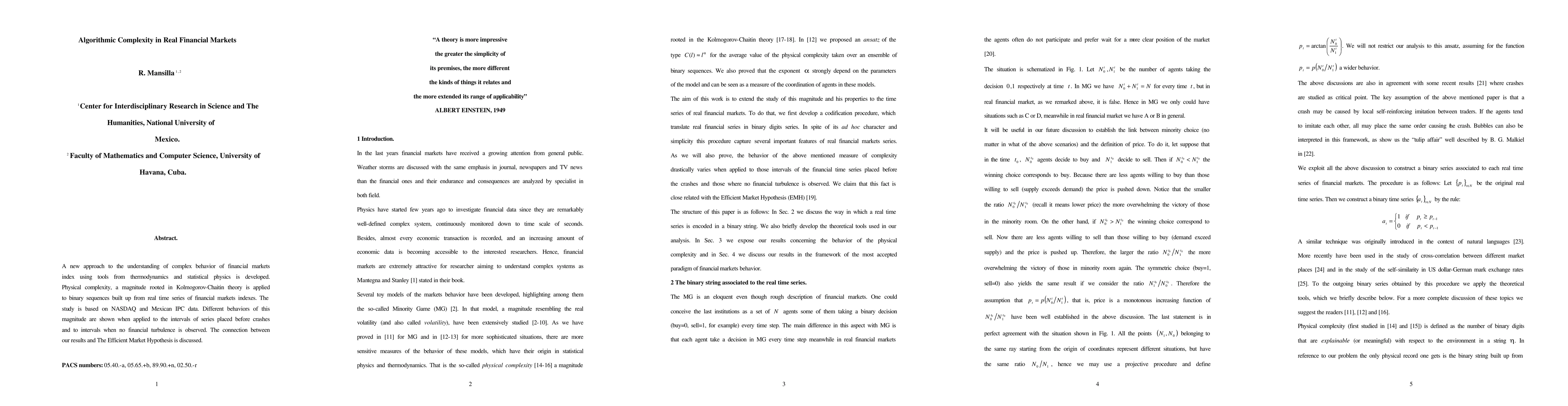 This paper introduces a novel method using thermodynamic and statistical physics tools to analyze the complexity of financial markets, applying physical complexity derived from Kolmogorov-Chaitin theory to NASDAQ and Mexican IPC index data. The study reveals distinct behaviors of this complexity measure before market crashes versus stable periods, and discusses its implications for the Efficient Market Hypothesis.