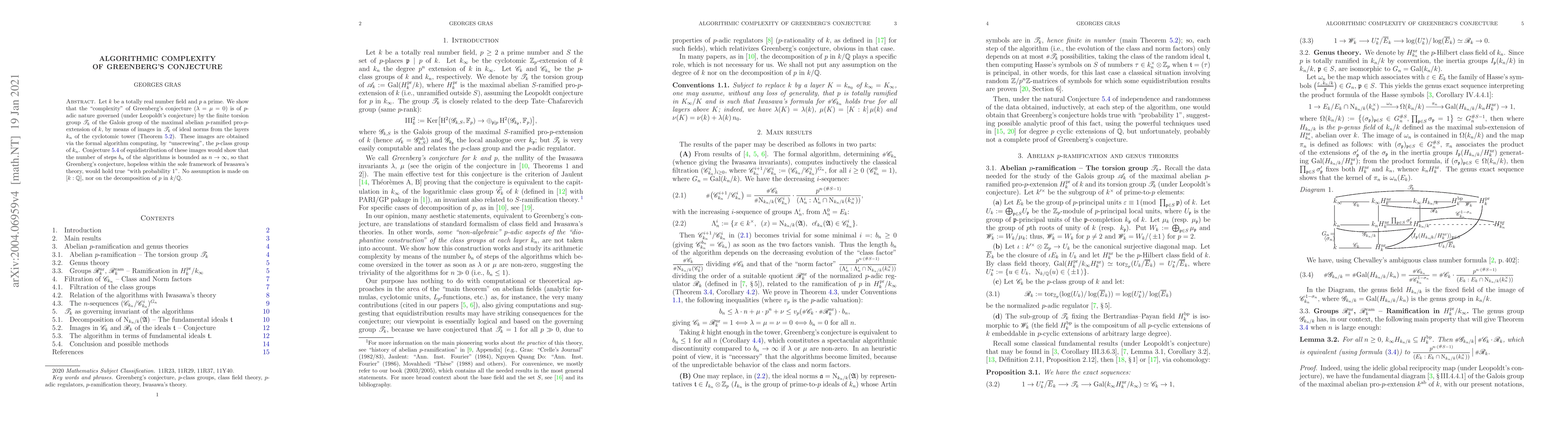 Let $k$ be a totally real number field and $p$ a prime. We show that the ``complexity'' of Greenberg's conjecture ($\lambda = \mu = 0$) is of $p$-adic nature governed (under Leopoldt's conjecture) by the finite torsion group ${\mathcal T}_k$ of the Galois group of the maximal abelian $p$-ramified pro-$p$-extension of $k$, by means of images in ${\mathcal T}_k$ of ideal norms from the layers $k_n$ of the cyclotomic tower (Theorem (5.2)). These images are obtained via the formal algorithm computing, by ``unscrewing'', the $p$-class group of~$k_n$. Conjecture (5.4) of equidistribution of these images would show that the number of steps $b_n$ of the algorithms is bounded as $n \to \infty$, so that Greenberg's conjecture, hopeless within the sole framework of Iwasawa's theory, would hold true ``with probability $1$''. No assumption is made on $[k : \mathbb{Q}]$, nor on the decomposition of $p$ in $k/\mathbb{Q}$.