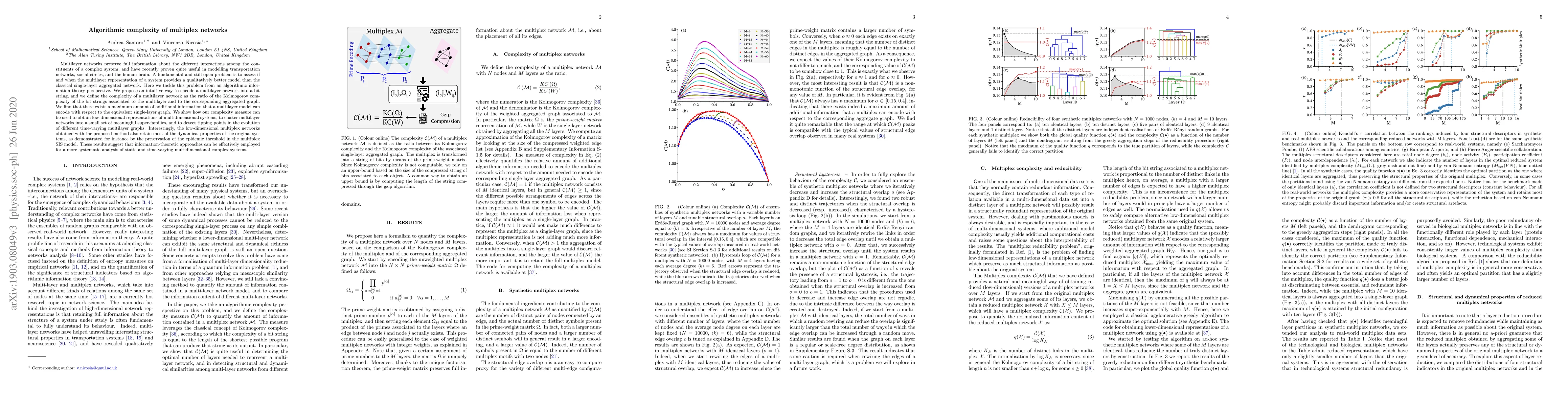 Multilayer networks preserve full information about the different interactions among the constituents of a complex system, and have recently proven quite useful in modelling transportation networks, social circles, and the human brain. A fundamental and still open problem is to assess if and when the multilayer representation of a system provides a qualitatively better model than the classical single-layer aggregated network. Here we tackle this problem from an algorithmic information theory perspective. We propose an intuitive way to encode a multilayer network into a bit string, and we define the complexity of a multilayer network as the ratio of the Kolmogorov complexity of the bit strings associated to the multilayer and to the corresponding aggregated graph. We find that there exists a maximum amount of additional information that a multilayer model can encode with respect to the equivalent single-layer graph. We show how our complexity measure can be used to obtain low-dimensional representations of multidimensional systems, to cluster multilayer networks into a small set of meaningful super-families, and to detect tipping points in the evolution of different time-varying multilayer graphs. Interestingly, the low-dimensional multiplex networks obtained with the proposed method also retain most of the dynamical properties of the original systems, as demonstrated for instance by the preservation of the epidemic threshold in the multiplex SIS model. These results suggest that information-theoretic approaches can be effectively employed for a more systematic analysis of static and time-varying multidimensional complex systems.