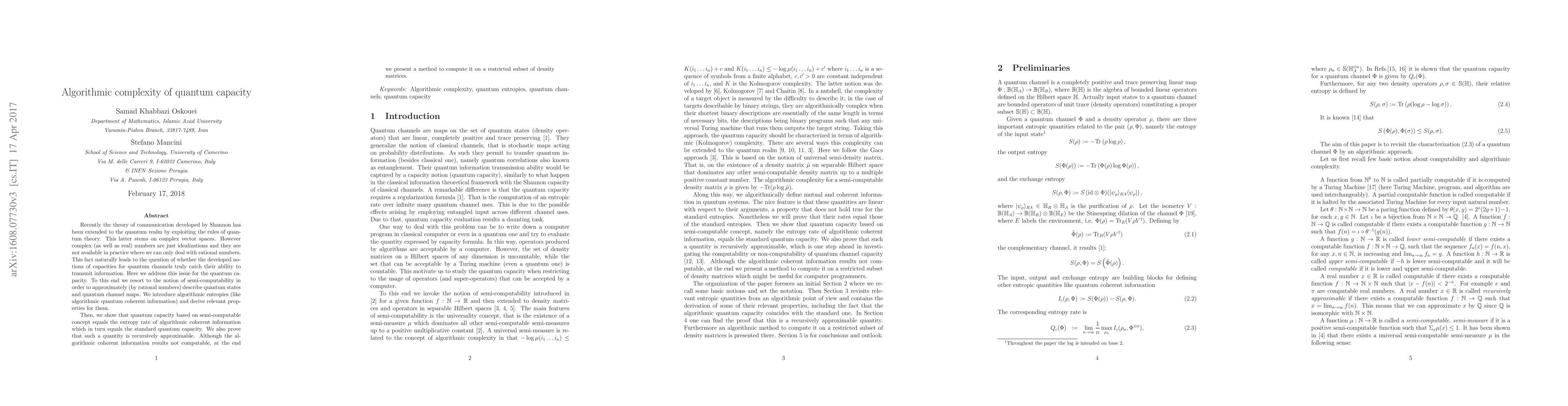 This paper investigates the algorithmic complexity of quantum capacity by introducing the concept of semi-computability to approximate quantum states and channels using rational numbers. It defines algorithmic quantum capacity and proves it equals the standard quantum capacity.