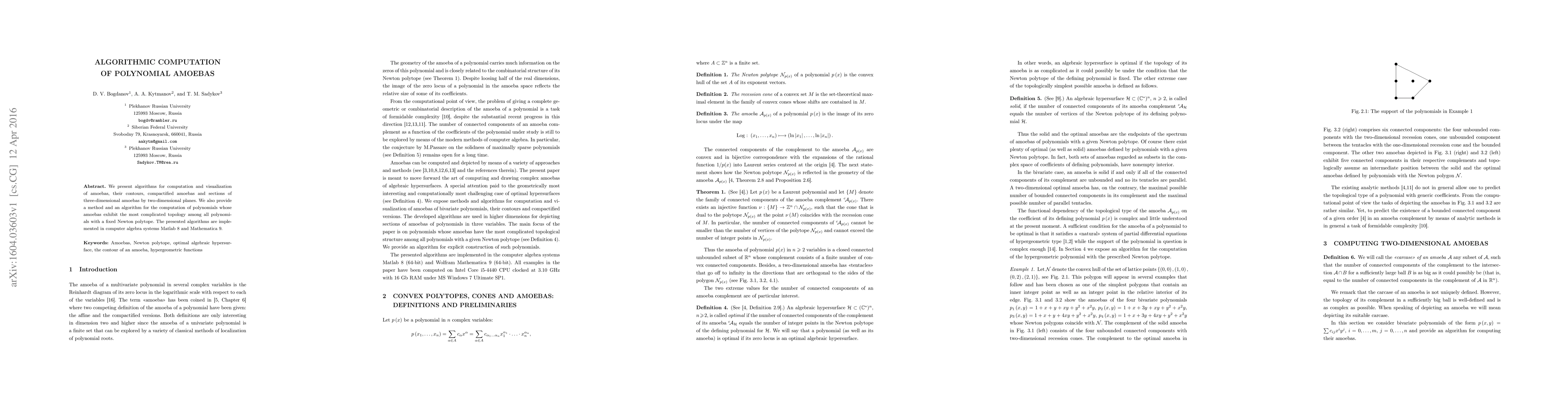 This paper introduces algorithms for computing and visualizing amoebas of polynomials, including their contours and sections, and presents methods to find polynomials with the most complex amoeba topology based on fixed Newton polytopes. The algorithms are implemented in Matlab 8 and Mathematica 9.