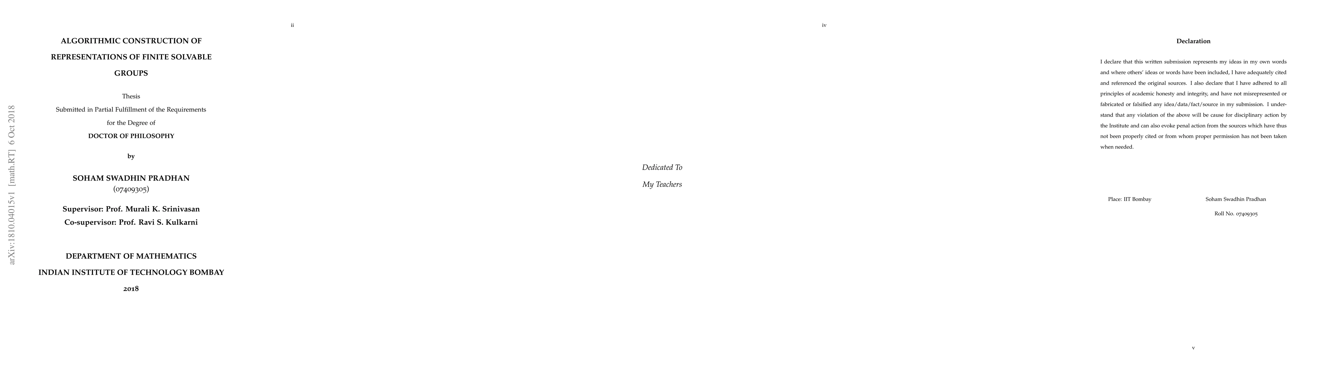 The dominant theme of this thesis is the construction of matrix representations of finite solvable groups using a suitable system of generators. For a finite solvable group $G$ of order $N = p_{1}p_{2}\dots p_{n}$, where $p_{i}$'s are primes, there always exists a subnormal series: $\langle {e} \rangle = G_{o} < G_{1} < \dots < G_{n} = G$ such that $G_{i}/G_{i-1}$ is isomorphic to a cyclic group of order $p_{i}$, $i = 1,2,\dots,n$. Associated with this series, there exists a system of generators consisting $n$ elements $x_{1}, x_{2}, \dots, x_{n}$ (say), such that $G_{i} = \langle x_{1}, x_{2}, \dots, x_{i} \rangle$, $i = 1,2,\dots,n$, which is called a "long system of generators". In terms of this system of generators and conjugacy class sum of $x_{i}$ in $G_{i}$, $i = 1,2, \dots, n$, we present an algorithm for constructing the irreducible matrix representations of $G$ over $\mathbb{C}$ within the group algebra $\mathbb{C}[G]$. This algorithmic construction needs the knowledge of primitive central idempotents, a well defined set of primitive (not necessarily central) idempotents and the "diagonal subalgebra" of $\mathbb{C}[G]$. In terms of this system of generators, we give simple expressions for the primitive central idempotents, a well defined system of primitive (not necessarily central) idempotents and a convenient set of generators of the "diagonal subalgebra" of $\mathbb{C}[G]$. For a finite abelian group, we present an algorithm for constructing the inequivalent irreducible matrix representations over a field of characteristic $0$ or prime to the order of the group and a systematic way of computing the primitive central idempotents of the group algebra. Besides that, we give simple expressions of the primitive central idempotents of the rational group algebra of a finite abelian group using a "long presentation" and it's Wedderburn decomposition.