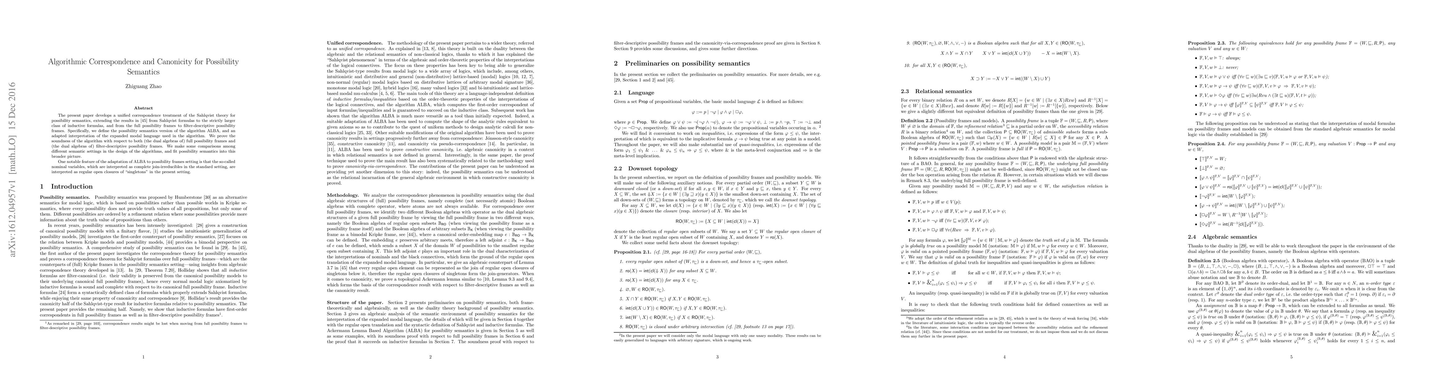 The present paper develops a unified correspondence treatment of the Sahlqvist theory for possibility semantics, extending the results in \cite{Ya16} from Sahlqvist formulas to the strictly larger class of inductive formulas, and from the full possibility frames to filter-descriptive possibility frames. Specifically, we define the possibility semantics version of the algorithm ALBA, and an adapted interpretation of the expanded modal language used in the algorithm. We prove the soundness of the algorithm with respect to both (the dual algebras of) full possibility frames and (the dual algebras of) filter-descriptive possibility frames. We make some comparisons among different semantic settings in the design of the algorithms, and fit possibility semantics into this broader picture. One notable feature of the adaptation of ALBA to possibility frames setting is that the so-called nominal variables, which are interpreted as complete join-irreducibles in the standard setting, are interpreted as regular open closures of "singletons" in the present setting.