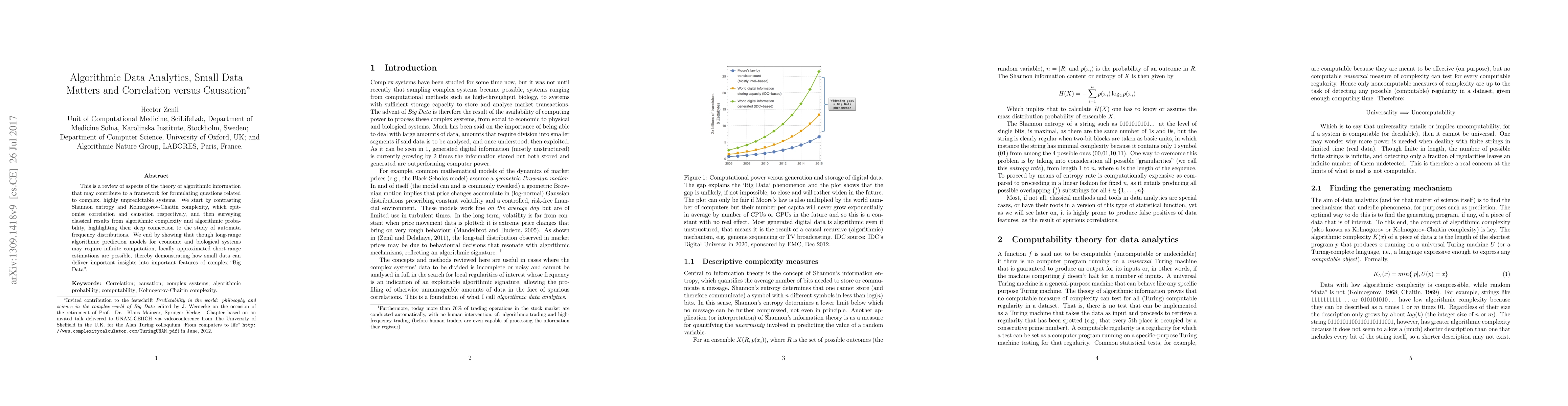 This is a review of aspects of the theory of algorithmic information that may contribute to a framework for formulating questions related to complex highly unpredictable systems. We start by contrasting Shannon Entropy and Kolmogorov-Chaitin complexity epitomizing the difference between correlation and causation to then move onto surveying classical results from algorithmic complexity and algorithmic probability, highlighting their deep connection to the study of automata frequency distributions. We end showing how long-range algorithmic predicting models for economic and biological systems may require infinite computation but locally approximated short-range estimations are possible thereby showing how small data can deliver important insights into important features of complex "Big Data".