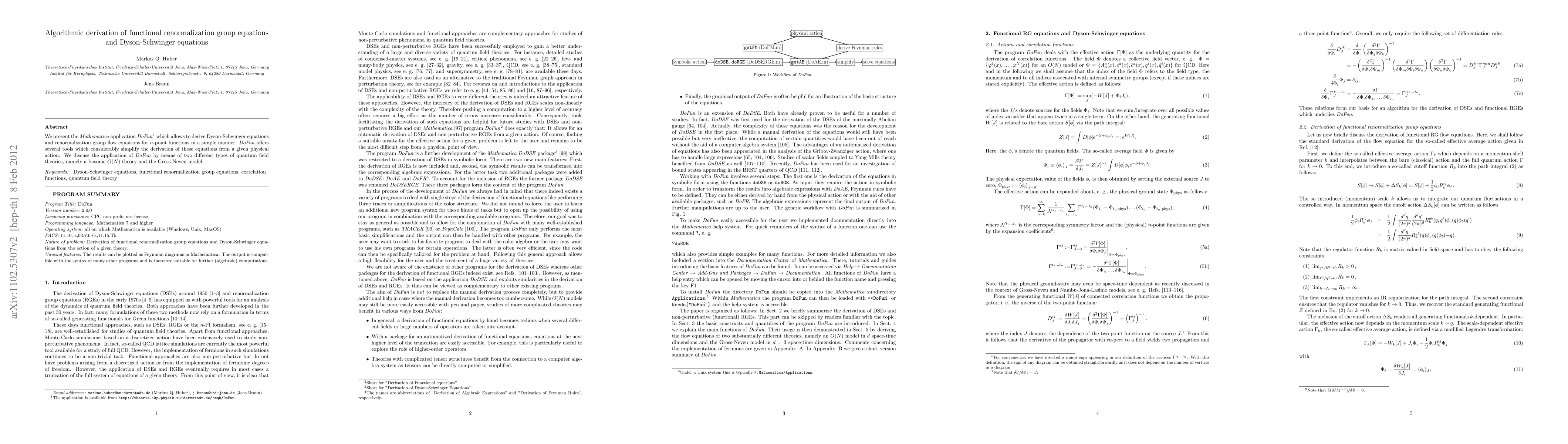 Summary: The paper introduces DoFun, a Mathematica application that simplifies the derivation of Dyson-Schwinger and renormalization group equations from a physical action, demonstrated through the O(N) bosonic theory and the Gross-Neveu model. This tool significantly eases the algorithmic derivation process for n-point functions.