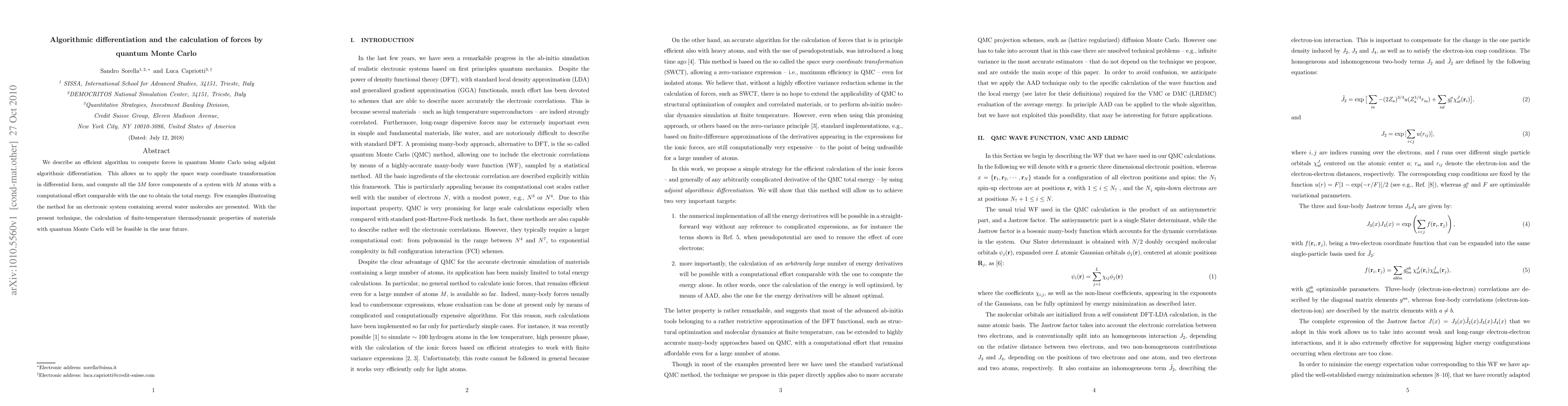 This paper presents an efficient algorithm for computing forces in quantum Monte Carlo simulations using adjoint algorithmic differentiation, enabling the application of space warp coordinate transformations and the calculation of 3M force components for M atoms with computational effort comparable to obtaining total energy. The method is demonstrated for electronic systems containing water molecules, paving the way for future calculations of finite-temperature thermodynamic properties.