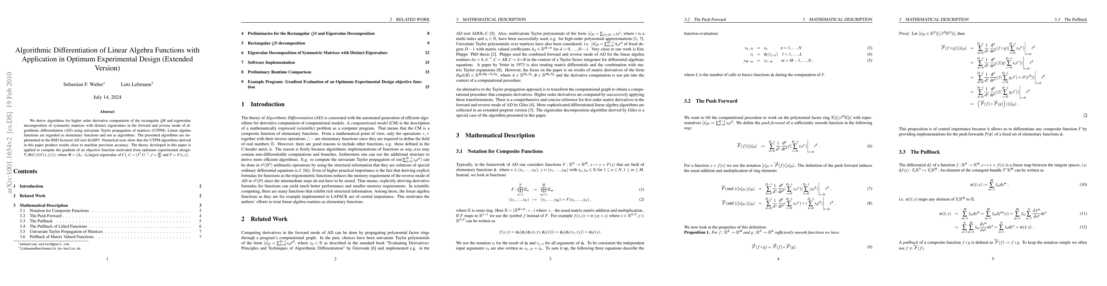 This paper presents algorithms for higher-order derivative computation of linear algebra functions using algorithmic differentiation, implemented in the ALGOPY tool. These algorithms achieve near-machine precision accuracy and are applied to optimize experimental design by computing gradients of complex objective functions.