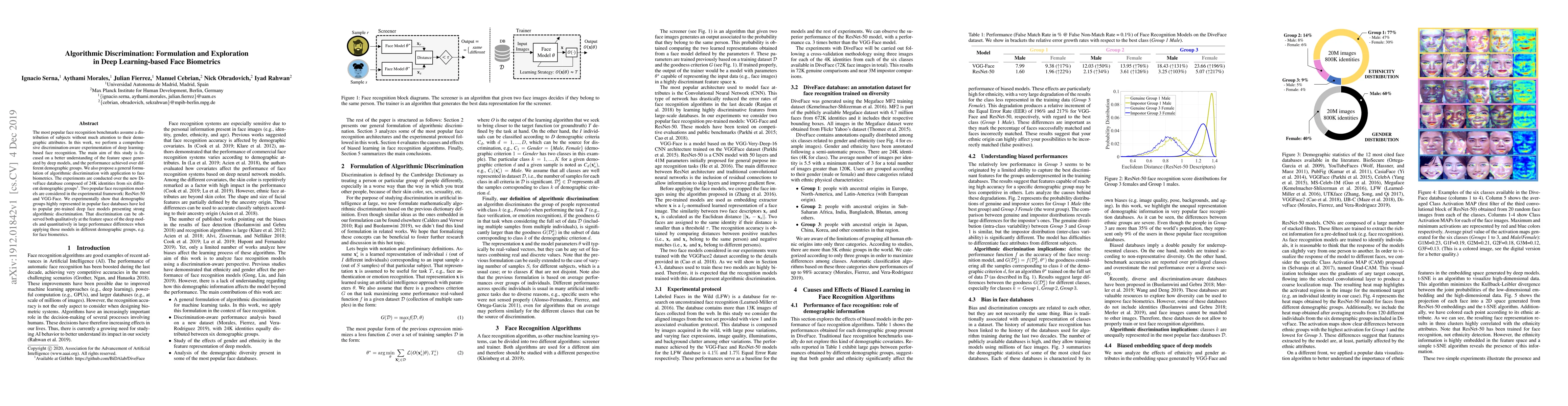 This paper investigates algorithmic discrimination in deep learning-based face recognition, focusing on performance disparities across demographic groups. It proposes a new formulation of algorithmic discrimination and demonstrates significant performance differences in models like ResNet-50 and VGG-Face when applied to underrepresented demographic groups in the DiveFace database.
