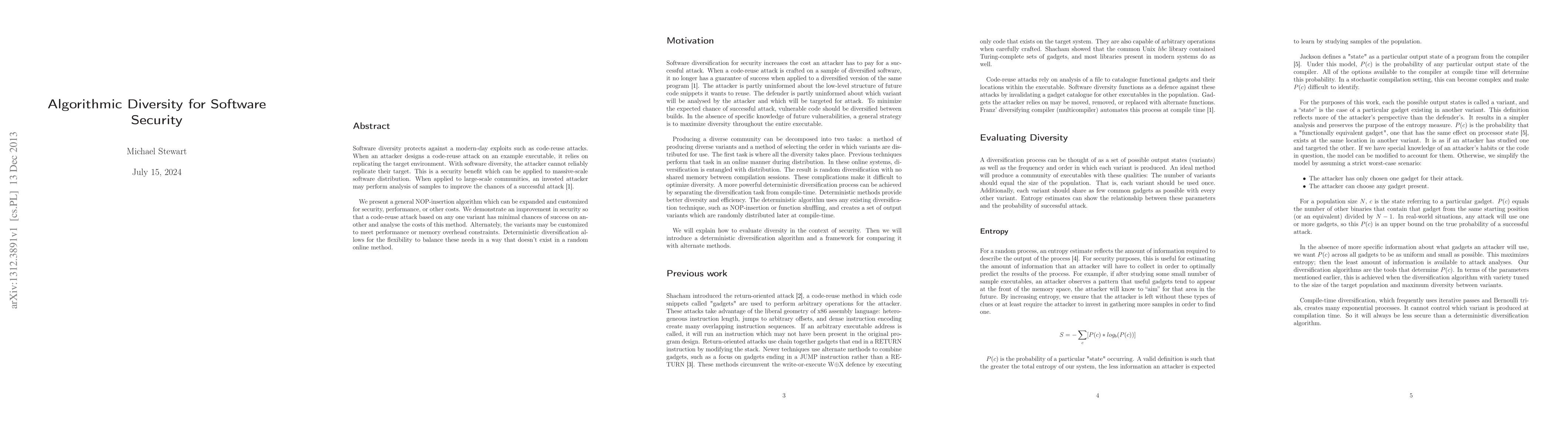 This paper presents a NOP-insertion algorithm to enhance software diversity, thereby improving security against code-reuse attacks by making it difficult for attackers to replicate the target environment. The method allows for customization to balance security, performance, and memory overhead, offering a deterministic approach over random online diversification.