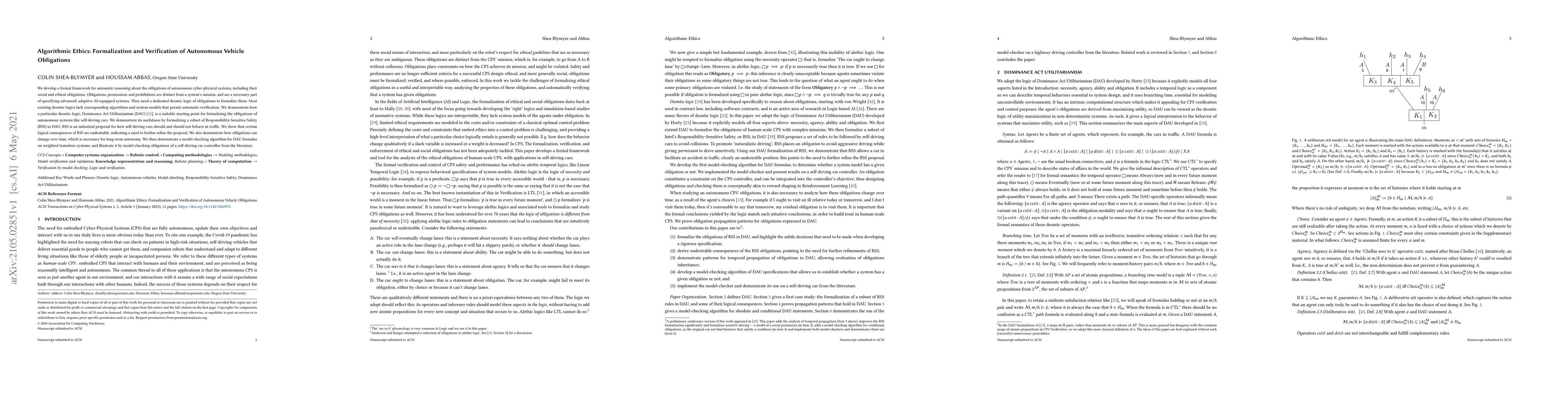 This paper develops a formal framework using a deontic logic called Dominance Act Utilitarianism (DAU) to reason about and verify the ethical obligations of autonomous vehicles, addressing limitations in existing deontic logics. It refines Responsibility-Sensitive Safety (RSS) and introduces a model-checking algorithm for DAU, demonstrating its application to a self-driving car controller.