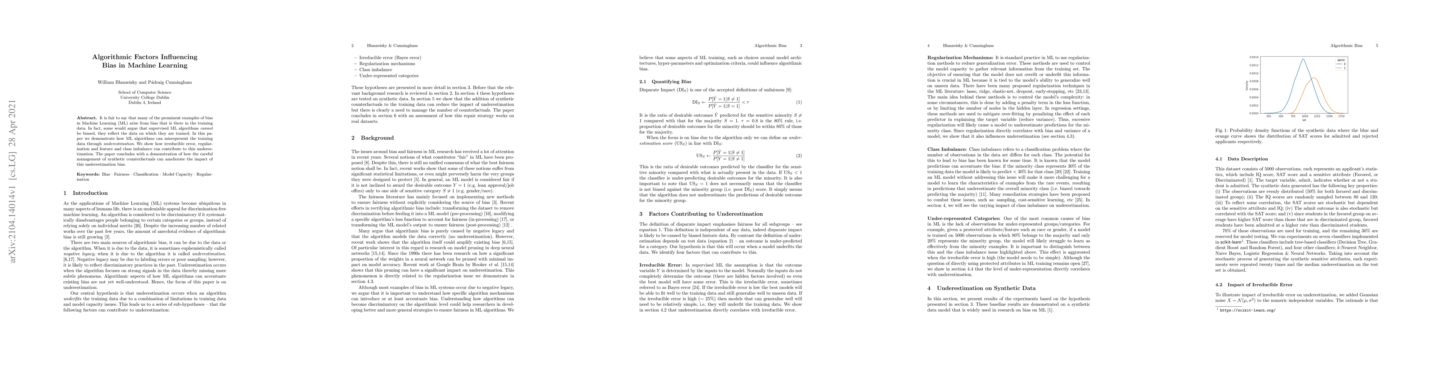 It is fair to say that many of the prominent examples of bias in Machine Learning (ML) arise from bias that is there in the training data. In fact, some would argue that supervised ML algorithms cannot be biased, they reflect the data on which they are trained. In this paper we demonstrate how ML algorithms can misrepresent the training data through underestimation. We show how irreducible error, regularization and feature and class imbalance can contribute to this underestimation. The paper concludes with a demonstration of how the careful management of synthetic counterfactuals can ameliorate the impact of this underestimation bias.