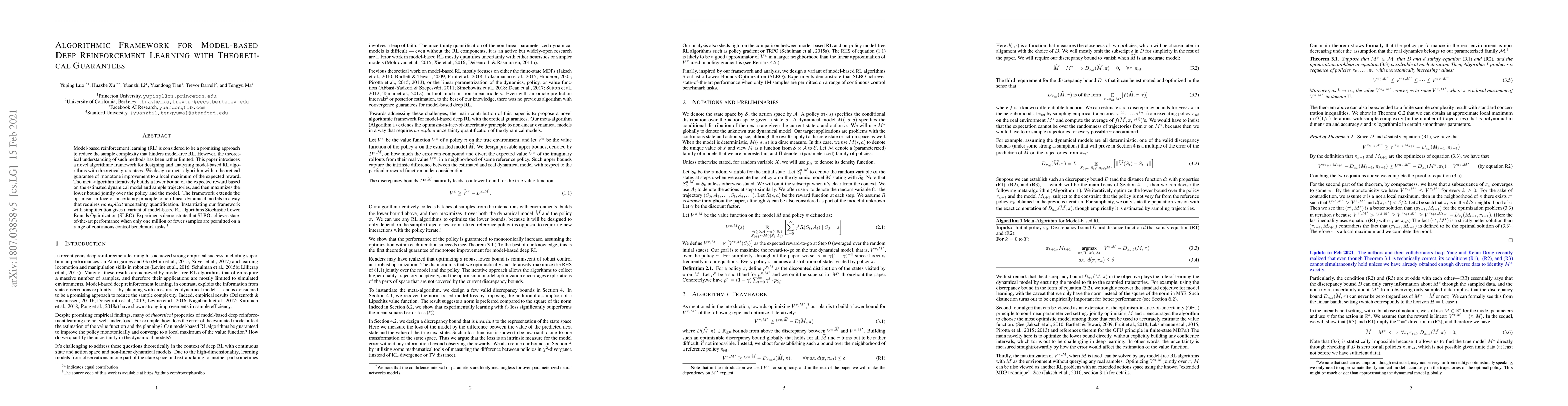 Model-based reinforcement learning (RL) is considered to be a promising approach to reduce the sample complexity that hinders model-free RL. However, the theoretical understanding of such methods has been rather limited. This paper introduces a novel algorithmic framework for designing and analyzing model-based RL algorithms with theoretical guarantees. We design a meta-algorithm with a theoretical guarantee of monotone improvement to a local maximum of the expected reward. The meta-algorithm iteratively builds a lower bound of the expected reward based on the estimated dynamical model and sample trajectories, and then maximizes the lower bound jointly over the policy and the model. The framework extends the optimism-in-face-of-uncertainty principle to non-linear dynamical models in a way that requires \textit{no explicit} uncertainty quantification. Instantiating our framework with simplification gives a variant of model-based RL algorithms Stochastic Lower Bounds Optimization (SLBO). Experiments demonstrate that SLBO achieves state-of-the-art performance when only one million or fewer samples are permitted on a range of continuous control benchmark tasks.