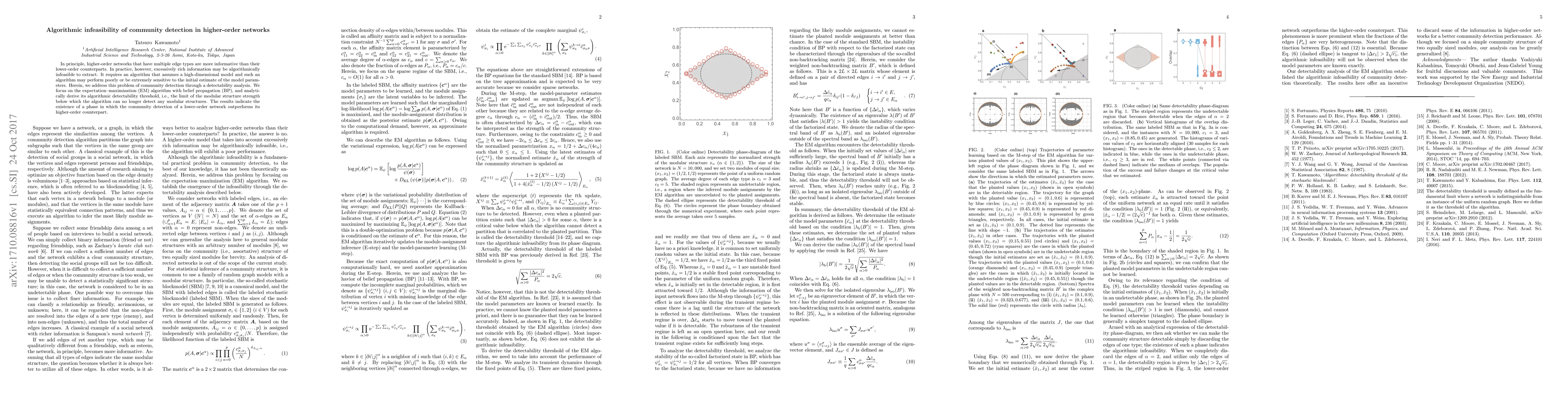 This research derives a detectability threshold for community detection in higher-order networks using the expectation-maximization algorithm with belief propagation. It reveals that simpler lower-order networks can outperform richer higher-order networks in detecting modular structures due to algorithmic infeasibility.