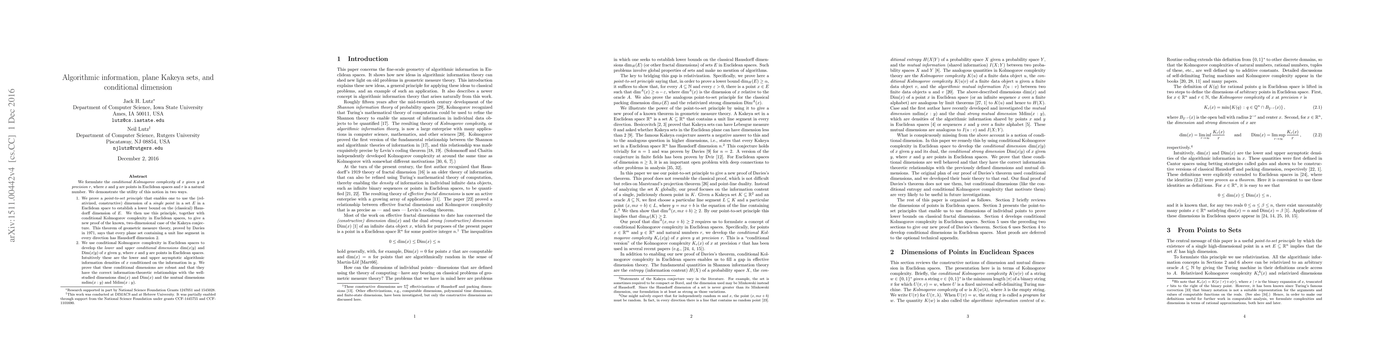This paper introduces the conditional Kolmogorov complexity of points in Euclidean spaces and demonstrates its utility in two ways: proving a new lower bound for the Hausdorff dimension using a point-to-set principle and providing a novel proof for the two-dimensional Kakeya conjecture, while also developing robust lower and upper conditional dimensions for points conditioned on other points.
