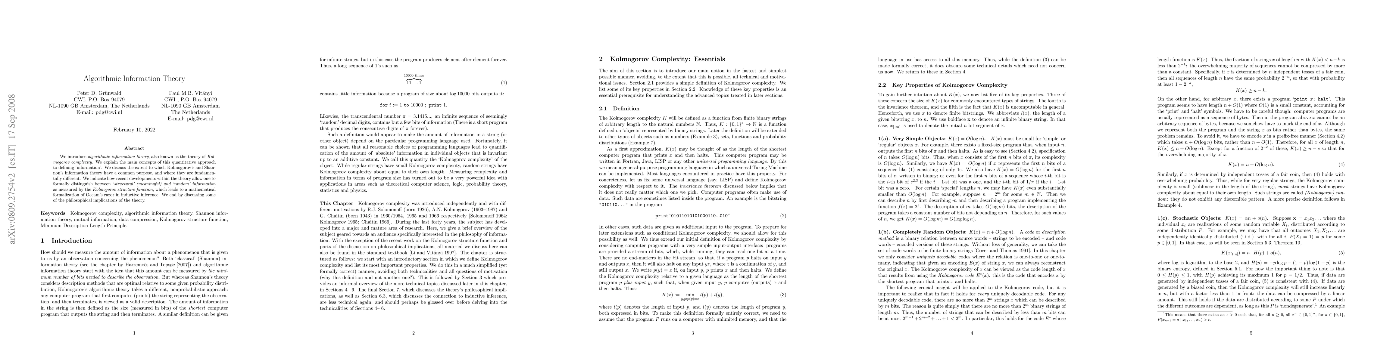 We introduce algorithmic information theory, also known as the theory of Kolmogorov complexity. We explain the main concepts of this quantitative approach to defining `information'. We discuss the extent to which Kolmogorov's and Shannon's information theory have a common purpose, and where they are fundamentally different. We indicate how recent developments within the theory allow one to formally distinguish between `structural' (meaningful) and `random' information as measured by the Kolmogorov structure function, which leads to a mathematical formalization of Occam's razor in inductive inference. We end by discussing some of the philosophical implications of the theory.