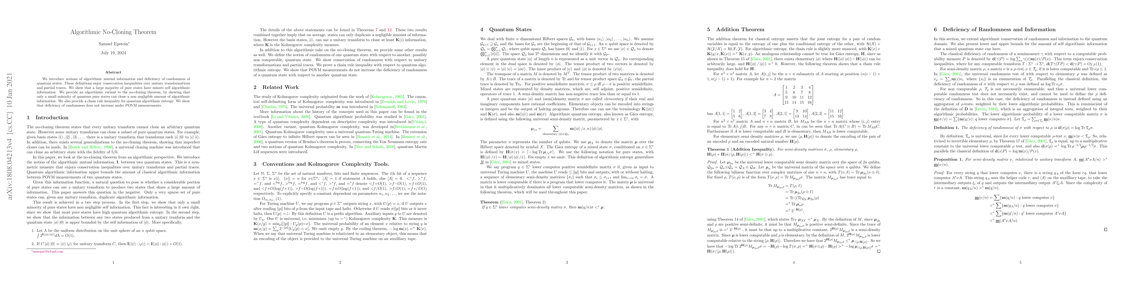This paper introduces the algorithmic no-cloning theorem, which shows that only a small minority of quantum pure states can clone non-negligible amounts of information, while most have minimal self-information.