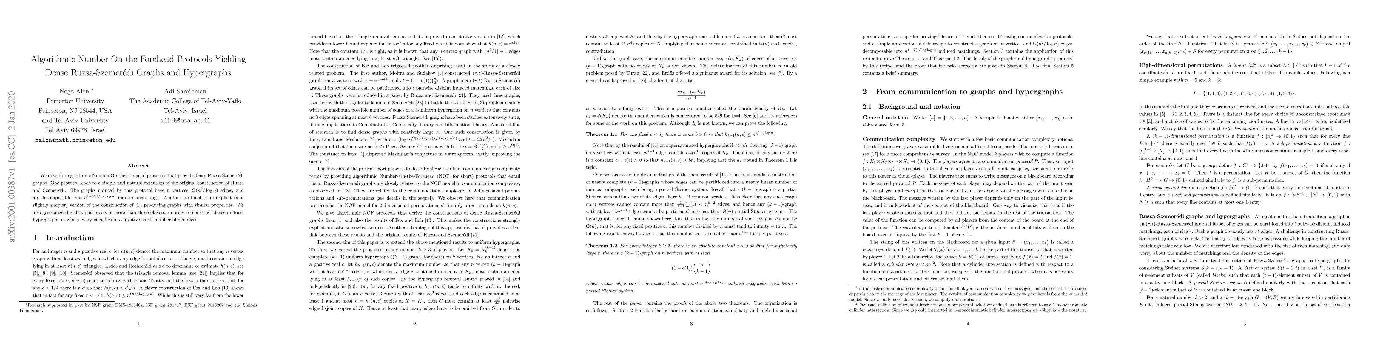 This paper presents algorithmic Number On the Forehead protocols to construct dense Ruzsa-Szemerédi graphs with $\Omega(n^2/\log n)$ edges and hypergraphs where every edge is part of a small number of simplices. The protocols extend existing constructions and generalize to multiple players.