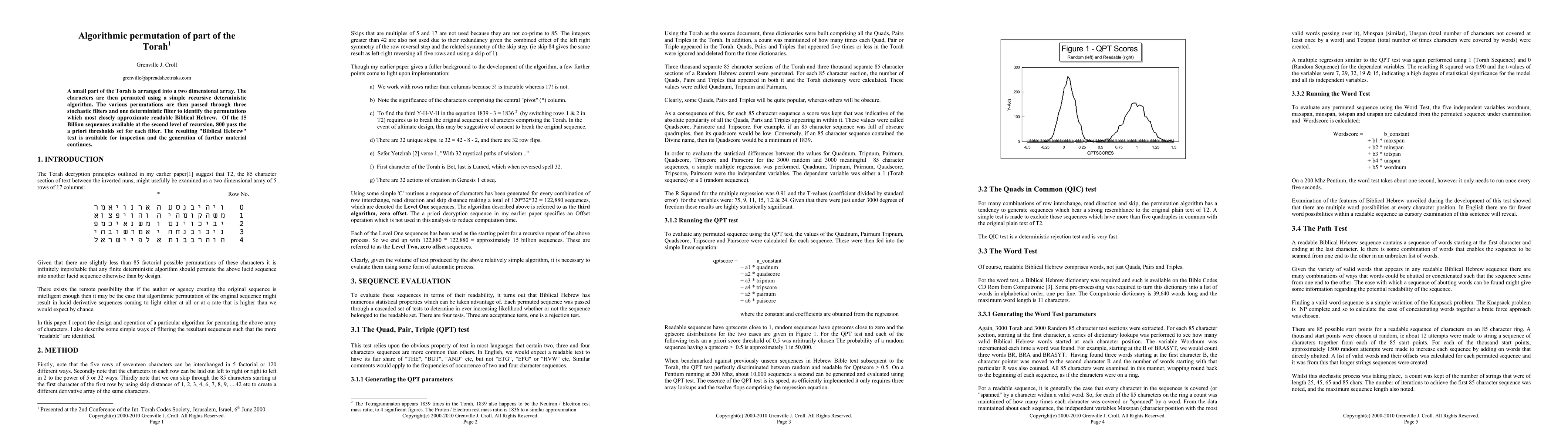 A small part of the Torah is arranged into a two dimensional array. The characters are then permuted using a simple recursive deterministic algorithm. The various permutations are then passed through three stochastic filters and one deterministic filter to identify the permutations which most closely approximate readable Biblical Hebrew. Of the 15 Billion sequences available at the second level of recursion, 800 pass the a priori thresholds set for each filter. The resulting "Biblical Hebrew" text is available for inspection and the generation of further material continues.