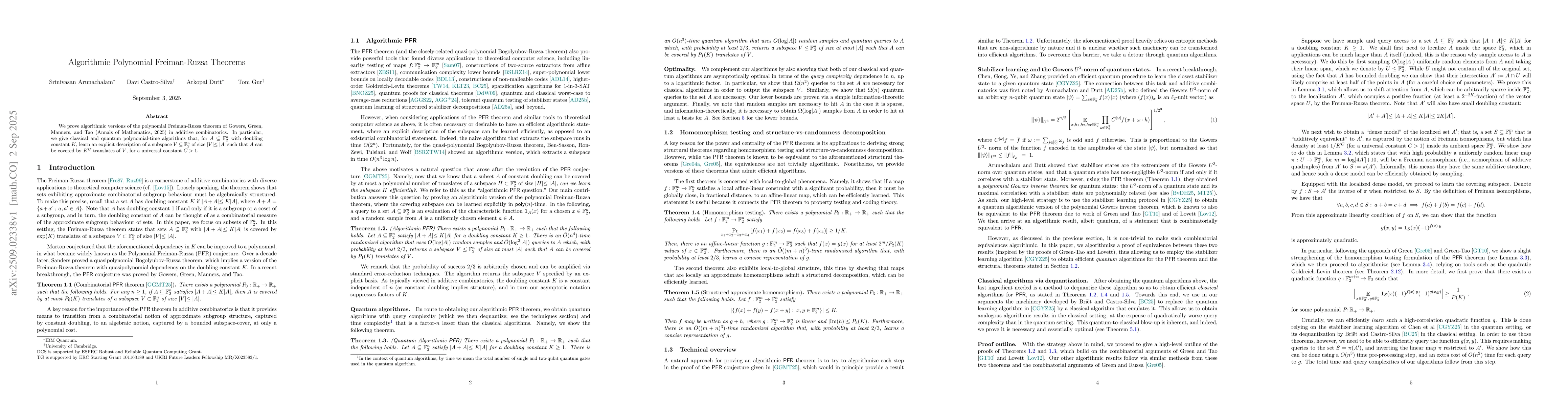 We prove algorithmic versions of the polynomial Freiman-Ruzsa theorem of Gowers, Green, Manners, and Tao (Annals of Mathematics, 2025) in additive combinatorics. In particular, we give classical and quantum polynomial-time algorithms that, for $A \subseteq \mathbb{F}_2^n$ with doubling constant $K$, learn an explicit description of a subspace $V \subseteq \mathbb{F}_2^n$ of size $|V| \leq |A|$ such that $A$ can be covered by $K^C$ translates of $V$, for a universal constant $C>1$.