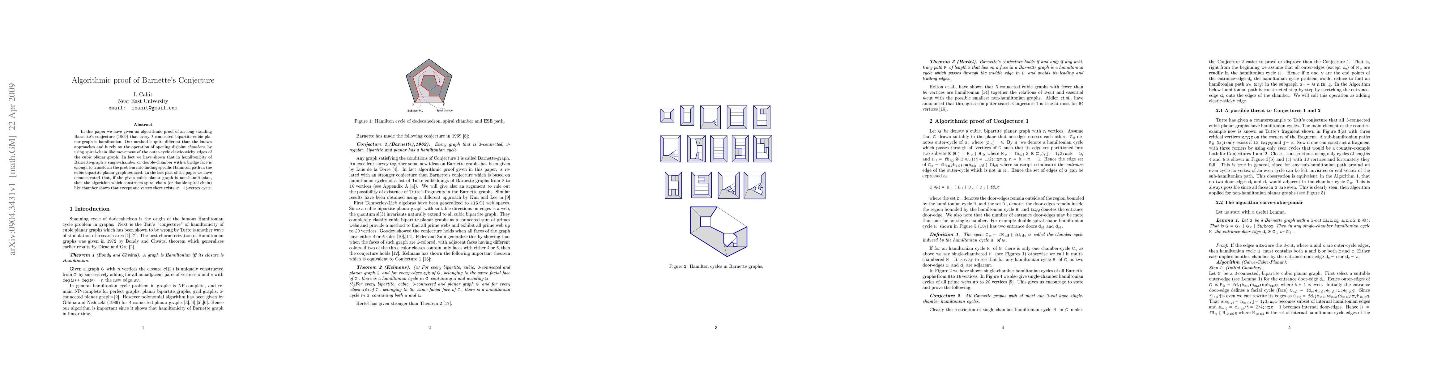 In this paper we have given an algorithmic proof of an long standing Barnette's conjecture (1969) that every 3-connected bipartite cubic planar graph is hamiltonian. Our method is quite different than the known approaches and it rely on the operation of opening disjoint chambers, bu using spiral-chain like movement of the outer-cycle elastic-sticky edges of the cubic planar graph. In fact we have shown that in hamiltonicity of Barnette graph a single-chamber or double-chamber with a bridge face is enough to transform the problem into finding specific hamiltonian path in the cubic bipartite graph reduced. In the last part of the paper we have demonstrated that, if the given cubic planar graph is non-hamiltonian then the algorithm which constructs spiral-chain (or double-spiral chain) like chamber shows that except one vertex there exists (n-1)-vertex cycle.