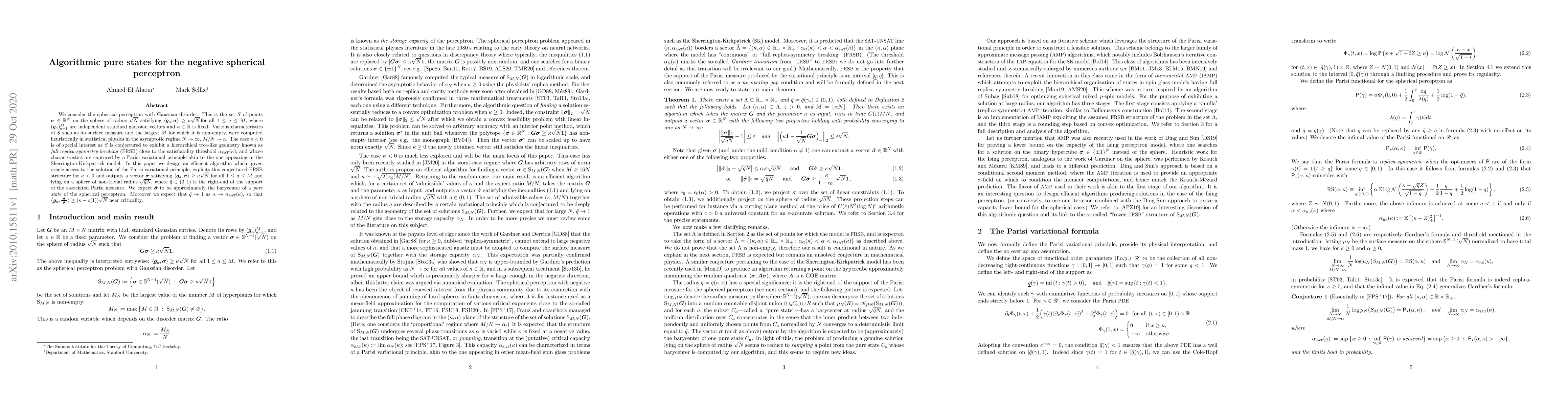 This paper presents an algorithm that, given access to the solution of a Parisi variational principle, generates a vector for the spherical perceptron with Gaussian disorder and negative $kappa$. The vector, $hat{sigma}$, is expected to approximate the barycenter of a pure state, lying on a sphere of radius $sqrt{ar{q} N}$, where $ar{q}$ approaches 1 as the satisfiability threshold $alpha_{ ext{SAT}}(kappa)$ is approached from below.