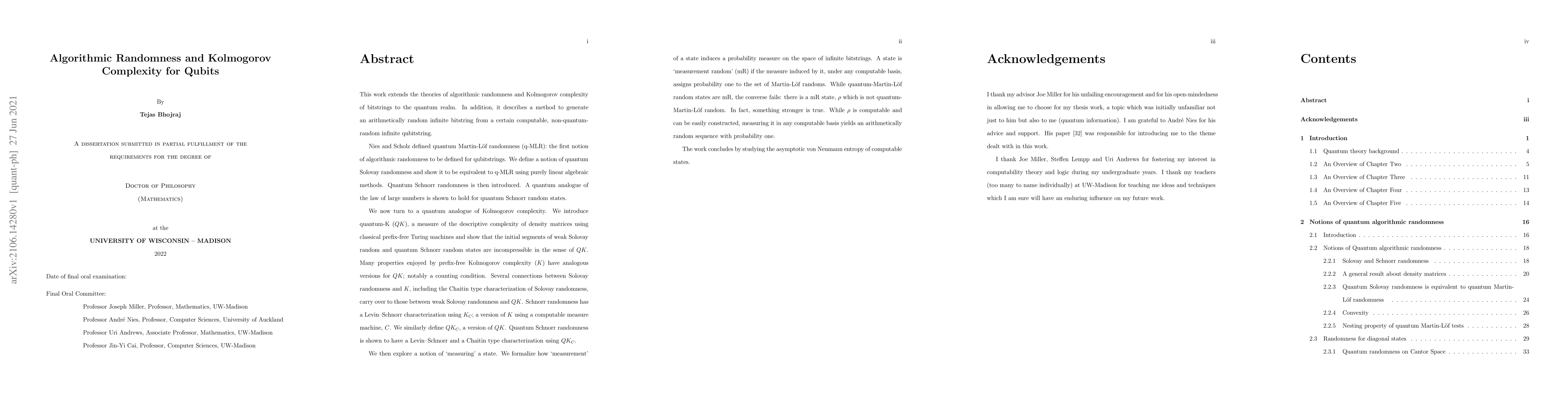 Nies and Scholz defined quantum Martin-L\"of randomness (q-MLR) for states (infinite qubitstrings). We define a notion of quantum Solovay randomness and show it to be equivalent to q-MLR using purely linear algebraic methods. Quantum Schnorr randomness is then introduced. A quantum analogue of the law of large numbers is shown to hold for quantum Schnorr random states. We introduce quantum-K, ($QK$) a measure of the descriptive complexity of density matrices using classical prefix-free Turing machines and show that the initial segments of weak Solovay random and quantum Schnorr random states are incompressible in the sense of $QK$. Several connections between Solovay randomness and $K$ carry over to those between weak Solovay randomness and $QK$. We then define $QK_C$, using computable measure machines and connect it to quantum Schnorr randomness. We then explore a notion of `measuring' a state. We formalize how `measurement' of a state induces a probability measure on the space of infinite bitstrings. A state is `measurement random' ($mR$) if the measure induced by it, under any computable basis, assigns probability one to the set of Martin-L\"of randoms. I.e., measuring a $mR$ state produces a Martin-L\"of random bitstring almost surely. While quantum-Martin-L\"of random states are $mR$, the converse fails: there is a $mR$ state, $\rho$ which is not quantum-Martin-L\"of random. In fact, something stronger is true. While $\rho$ is computable and can be easily constructed, measuring it in any computable basis yields an arithmetically random sequence with probability one. So, classical randomness can be generated from a computable state which is not quantum random. We conclude by studying the asymptotic von Neumann entropy of computable states.