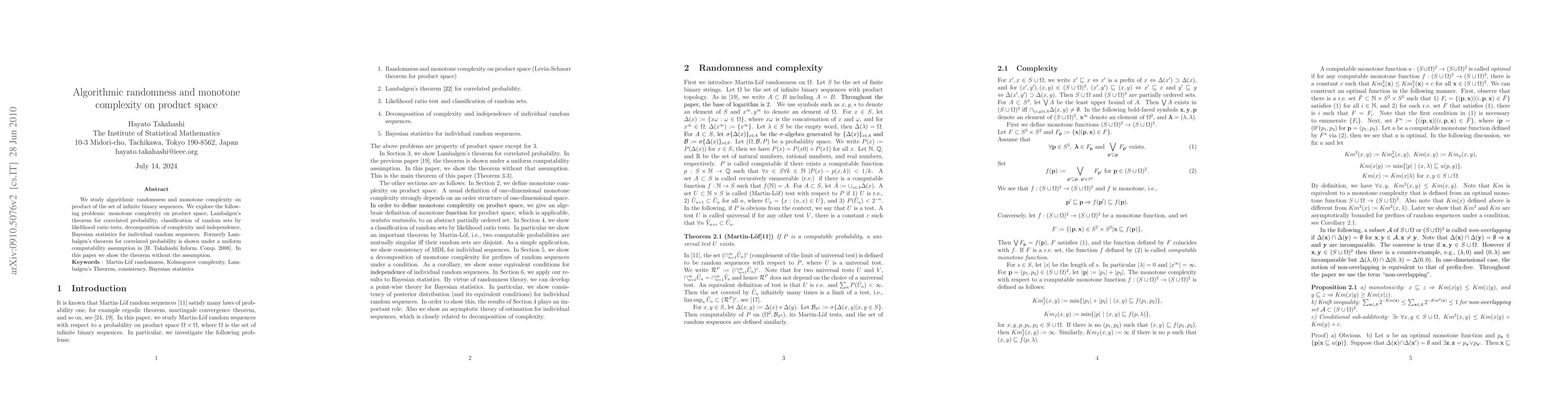 We study algorithmic randomness and monotone complexity on product of the set of infinite binary sequences. We explore the following problems: monotone complexity on product space, Lambalgen's theorem for correlated probability, classification of random sets by likelihood ratio tests, decomposition of complexity and independence, Bayesian statistics for individual random sequences. Formerly Lambalgen's theorem for correlated probability is shown under a uniform computability assumption in [H. Takahashi Inform. Comp. 2008]. In this paper we show the theorem without the assumption.