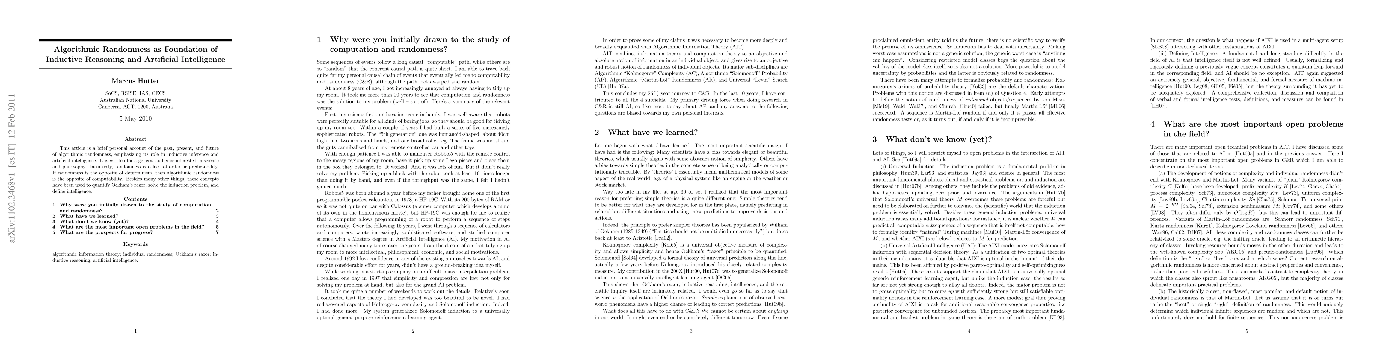 This article is a brief personal account of the past, present, and future of algorithmic randomness, emphasizing its role in inductive inference and artificial intelligence. It is written for a general audience interested in science and philosophy. Intuitively, randomness is a lack of order or predictability. If randomness is the opposite of determinism, then algorithmic randomness is the opposite of computability. Besides many other things, these concepts have been used to quantify Ockham's razor, solve the induction problem, and define intelligence.