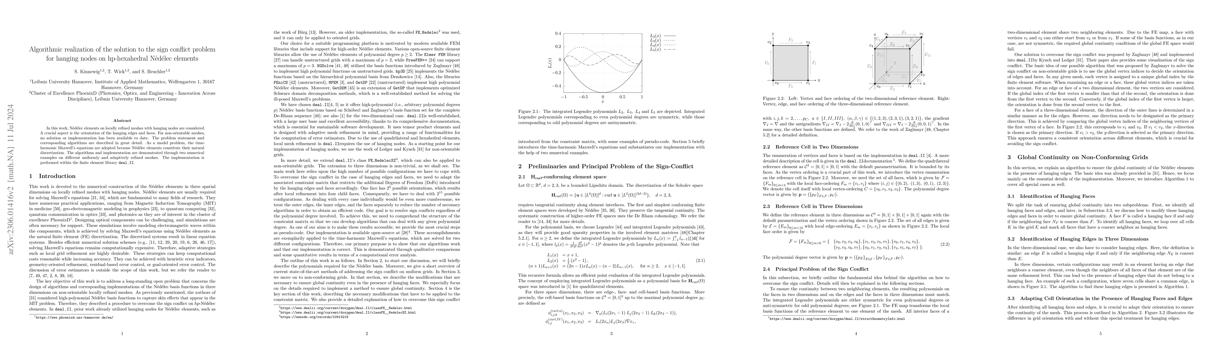 This paper presents an algorithmic solution to the sign conflict problem for hanging nodes in hp-hexahedral N\'ed\'elec elements, addressing the lack of previous solutions for non-orientable meshes. The time-harmonic Maxwell's equations are used as a model problem, and the implementation is demonstrated through numerical examples in the deal.II finite element library.