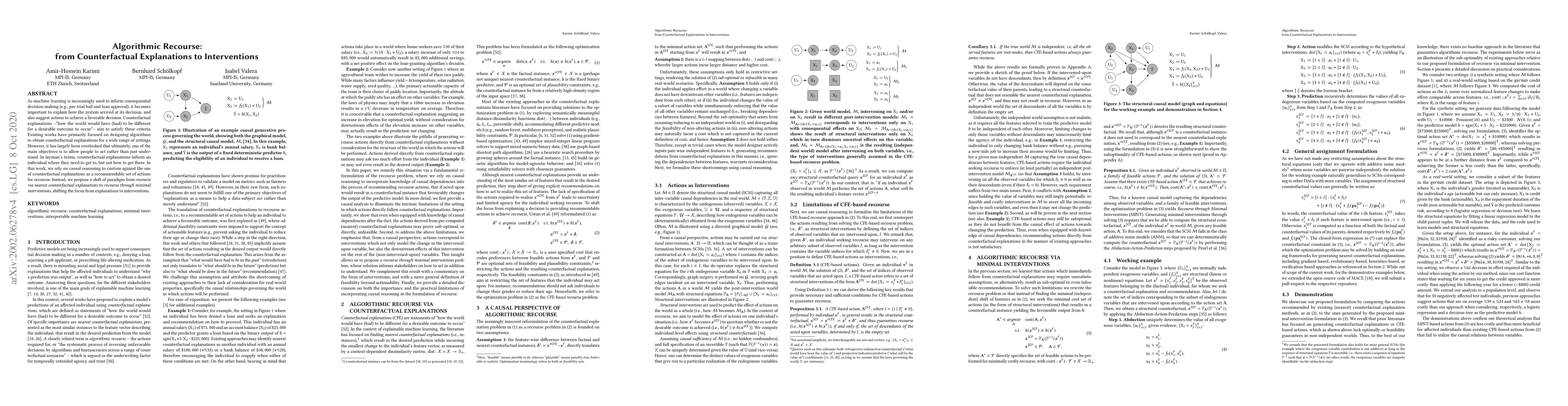 As machine learning is increasingly used to inform consequential decision-making (e.g., pre-trial bail and loan approval), it becomes important to explain how the system arrived at its decision, and also suggest actions to achieve a favorable decision. Counterfactual explanations -- "how the world would have (had) to be different for a desirable outcome to occur" -- aim to satisfy these criteria. Existing works have primarily focused on designing algorithms to obtain counterfactual explanations for a wide range of settings. However, one of the main objectives of "explanations as a means to help a data-subject act rather than merely understand" has been overlooked. In layman's terms, counterfactual explanations inform an individual where they need to get to, but not how to get there. In this work, we rely on causal reasoning to caution against the use of counterfactual explanations as a recommendable set of actions for recourse. Instead, we propose a shift of paradigm from recourse via nearest counterfactual explanations to recourse through minimal interventions, moving the focus from explanations to recommendations. Finally, we provide the reader with an extensive discussion on how to realistically achieve recourse beyond structural interventions.