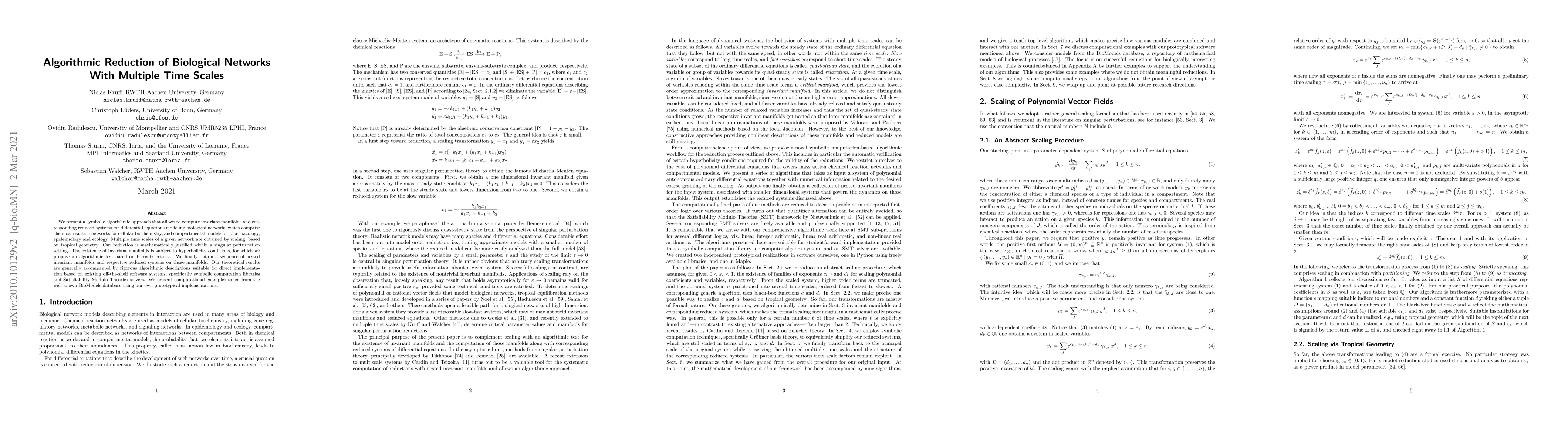 This paper introduces an algorithmic method for reducing complex biological networks with multiple time scales, employing symbolic computation and tropical geometry to derive invariant manifolds and reduced systems. The approach is mathematically grounded and includes an algorithmic test for hyperbolicity conditions, demonstrating its application through examples from the BioModels database.