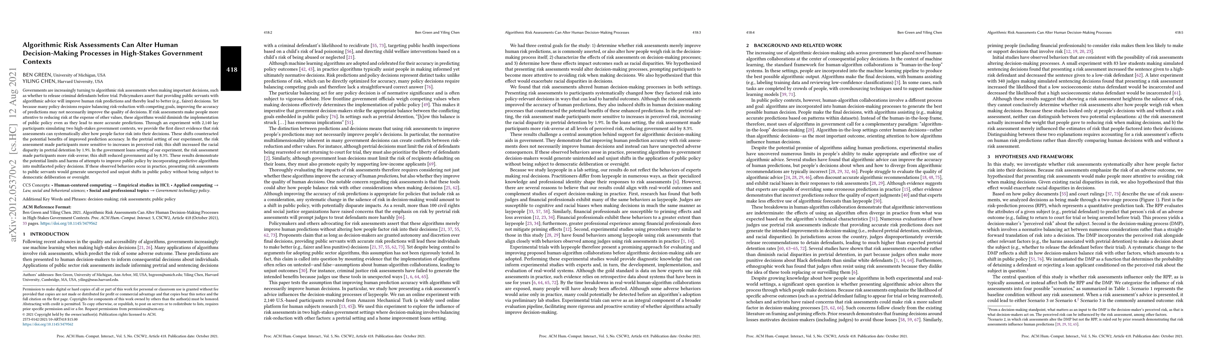 This study finds that algorithmic risk assessments can significantly alter human decision-making in high-stakes government contexts, often leading to unintended negative consequences. While intended to improve risk predictions, these algorithms can increase racial disparities and reduce public aid, highlighting the potential harms of integrating predictive algorithms into complex policy decisions.