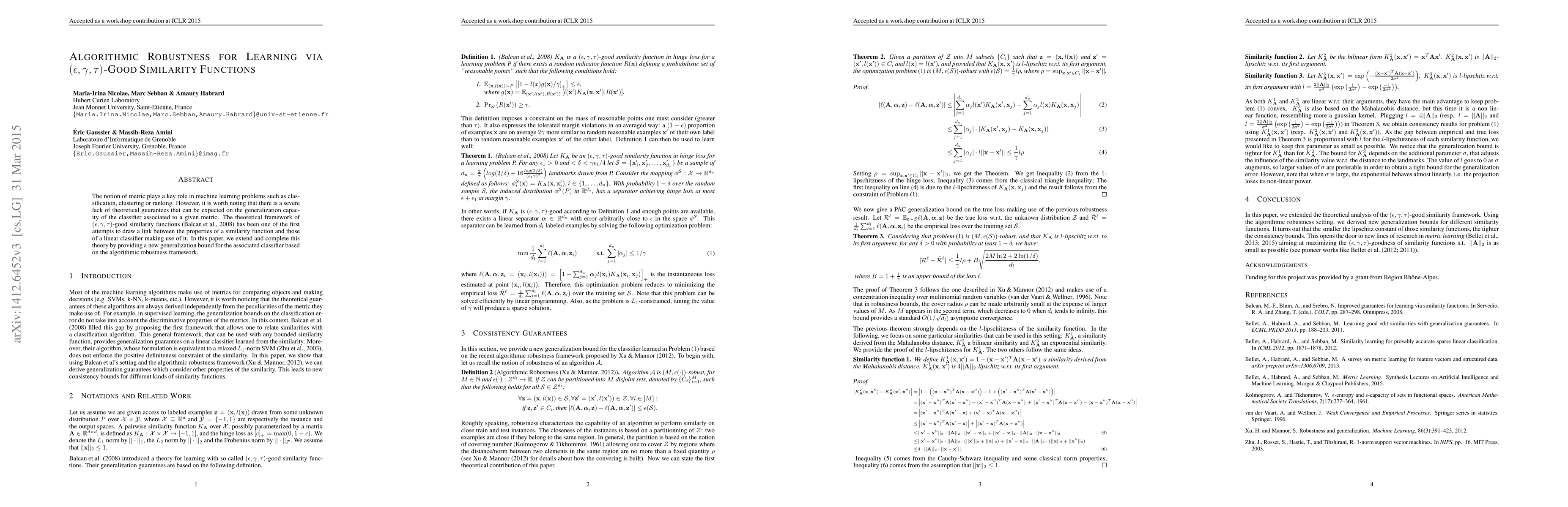 The notion of metric plays a key role in machine learning problems such as classification, clustering or ranking. However, it is worth noting that there is a severe lack of theoretical guarantees that can be expected on the generalization capacity of the classifier associated to a given metric. The theoretical framework of $(\epsilon, \gamma, \tau)$-good similarity functions (Balcan et al., 2008) has been one of the first attempts to draw a link between the properties of a similarity function and those of a linear classifier making use of it. In this paper, we extend and complete this theory by providing a new generalization bound for the associated classifier based on the algorithmic robustness framework.