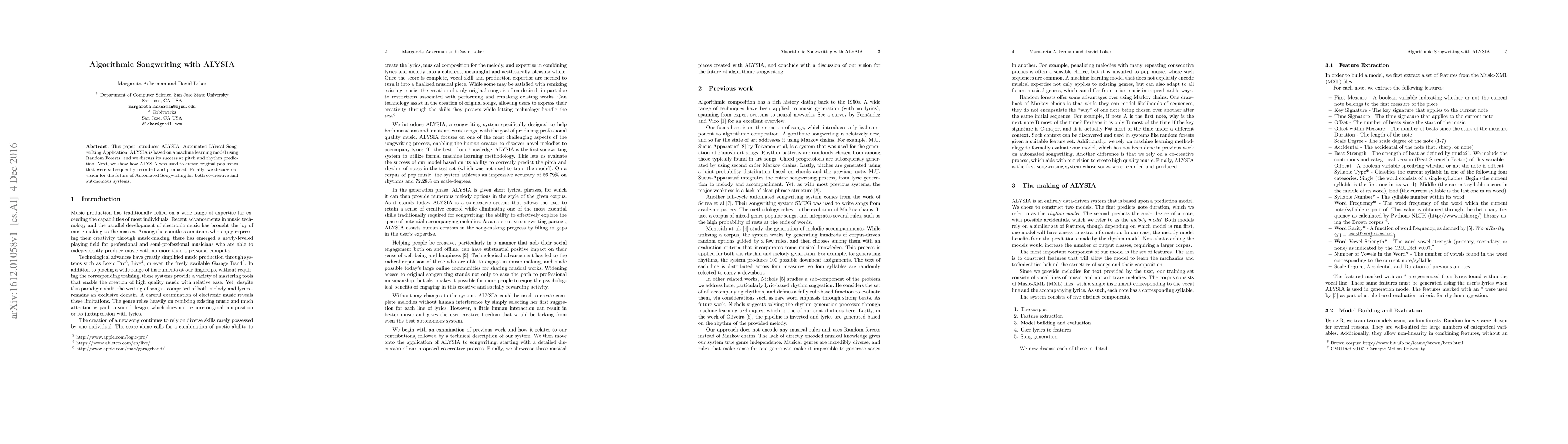 A machine learning model called ALYSIA uses Random Forests to create original pop songs with accurate pitch and rhythm prediction. It demonstrates the potential for automated songwriting in both collaborative and autonomous systems.
