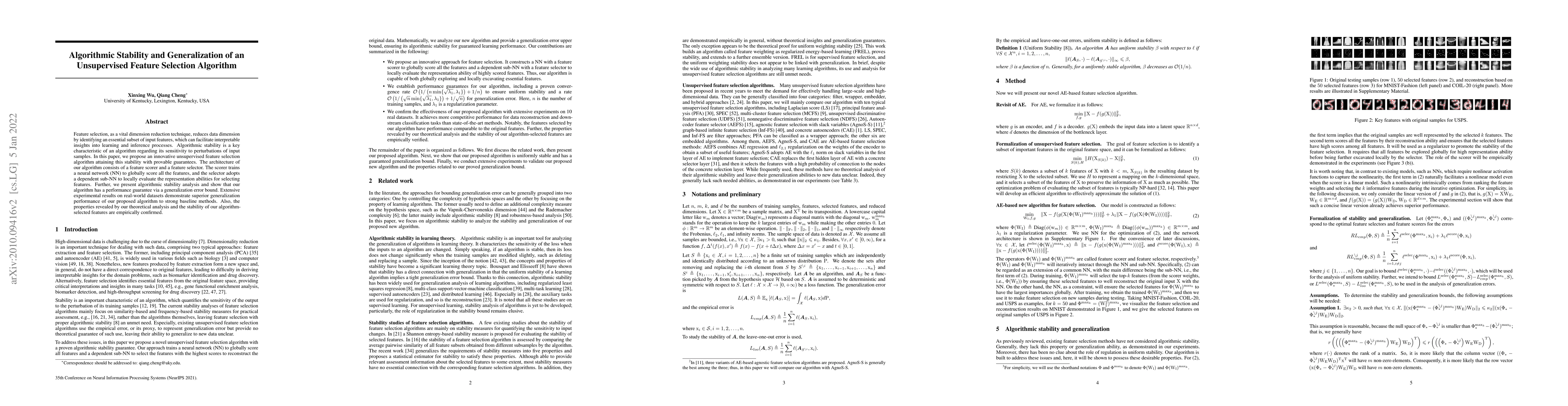 This paper proposes an unsupervised feature selection algorithm that achieves algorithmic stability with provable guarantees. The algorithm comprises a feature scorer and a feature selector, with the former using a neural network to globally score features and the latter employing a sub-neural network to evaluate feature representation abilities. The authors provide a stability analysis and demonstrate superior generalization performance through experimental results on real-world datasets.