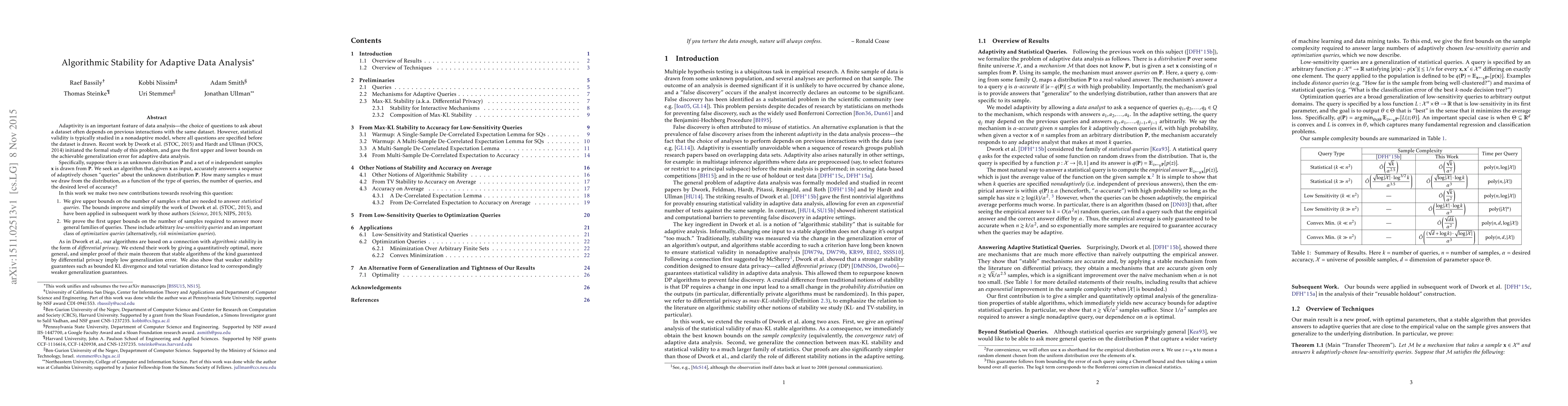 Adaptivity is an important feature of data analysis---the choice of questions to ask about a dataset often depends on previous interactions with the same dataset. However, statistical validity is typically studied in a nonadaptive model, where all questions are specified before the dataset is drawn. Recent work by Dwork et al. (STOC, 2015) and Hardt and Ullman (FOCS, 2014) initiated the formal study of this problem, and gave the first upper and lower bounds on the achievable generalization error for adaptive data analysis. Specifically, suppose there is an unknown distribution $\mathbf{P}$ and a set of $n$ independent samples $\mathbf{x}$ is drawn from $\mathbf{P}$. We seek an algorithm that, given $\mathbf{x}$ as input, accurately answers a sequence of adaptively chosen queries about the unknown distribution $\mathbf{P}$. How many samples $n$ must we draw from the distribution, as a function of the type of queries, the number of queries, and the desired level of accuracy? In this work we make two new contributions: (i) We give upper bounds on the number of samples $n$ that are needed to answer statistical queries. The bounds improve and simplify the work of Dwork et al. (STOC, 2015), and have been applied in subsequent work by those authors (Science, 2015, NIPS, 2015). (ii) We prove the first upper bounds on the number of samples required to answer more general families of queries. These include arbitrary low-sensitivity queries and an important class of optimization queries. As in Dwork et al., our algorithms are based on a connection with algorithmic stability in the form of differential privacy. We extend their work by giving a quantitatively optimal, more general, and simpler proof of their main theorem that stability implies low generalization error. We also study weaker stability guarantees such as bounded KL divergence and total variation distance.