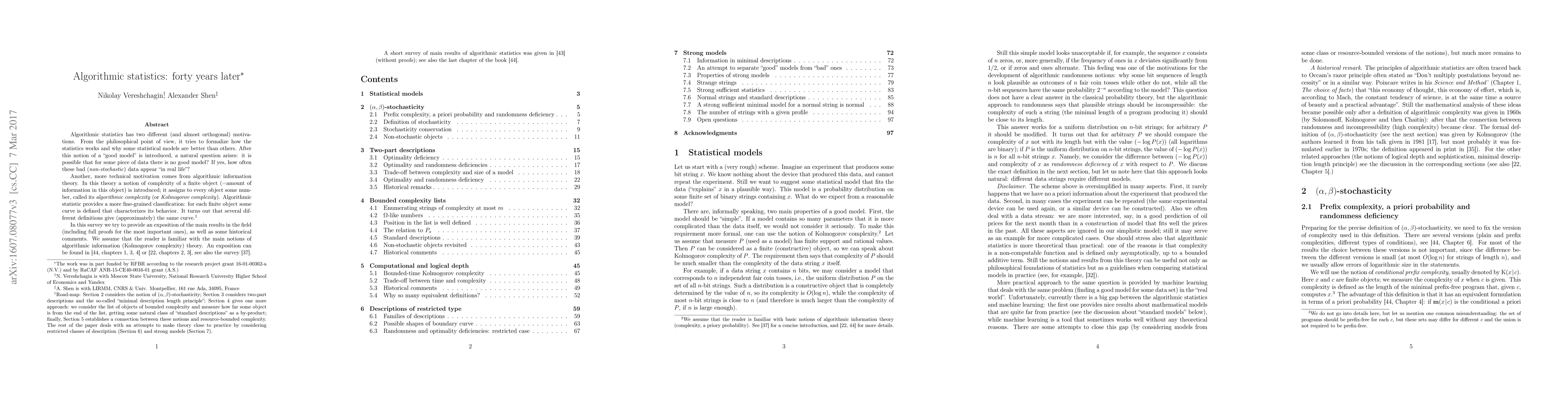 Algorithmic statistics has two different (and almost orthogonal) motivations. From the philosophical point of view, it tries to formalize how the statistics works and why some statistical models are better than others. After this notion of a "good model" is introduced, a natural question arises: it is possible that for some piece of data there is no good model? If yes, how often these bad ("non-stochastic") data appear "in real life"? Another, more technical motivation comes from algorithmic information theory. In this theory a notion of complexity of a finite object (=amount of information in this object) is introduced; it assigns to every object some number, called its algorithmic complexity (or Kolmogorov complexity). Algorithmic statistic provides a more fine-grained classification: for each finite object some curve is defined that characterizes its behavior. It turns out that several different definitions give (approximately) the same curve. In this survey we try to provide an exposition of the main results in the field (including full proofs for the most important ones), as well as some historical comments. We assume that the reader is familiar with the main notions of algorithmic information (Kolmogorov complexity) theory.