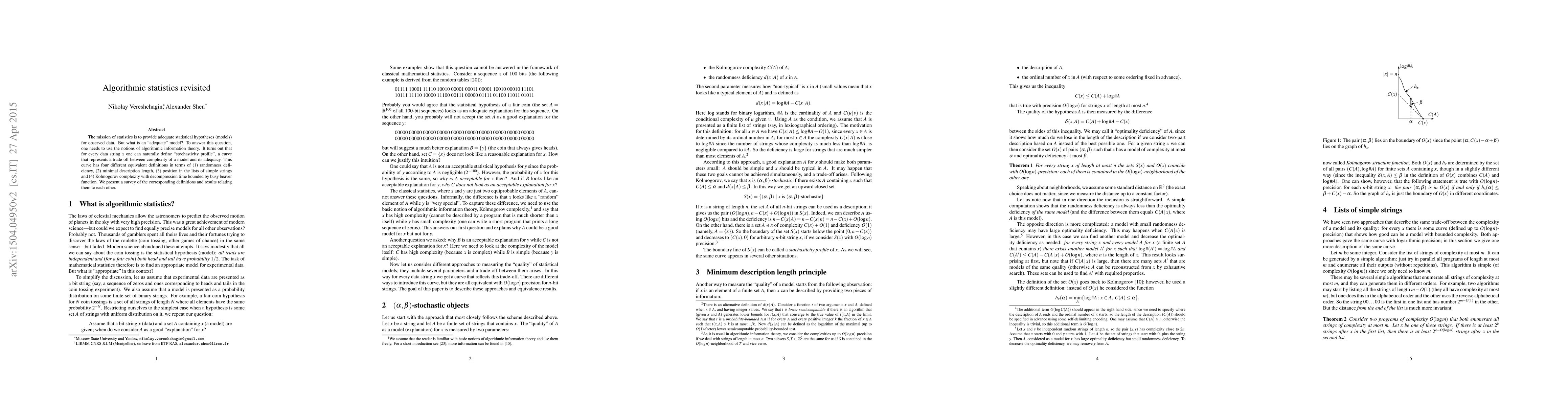 The mission of statistics is to provide adequate statistical hypotheses (models) for observed data. But what is an "adequate" model? To answer this question, one needs to use the notions of algorithmic information theory. It turns out that for every data string $x$ one can naturally define "stochasticity profile", a curve that represents a trade-off between complexity of a model and its adequacy. This curve has four different equivalent definitions in terms of (1)~randomness deficiency, (2)~minimal description length, (3)~position in the lists of simple strings and (4)~Kolmogorov complexity with decompression time bounded by busy beaver function. We present a survey of the corresponding definitions and results relating them to each other.
