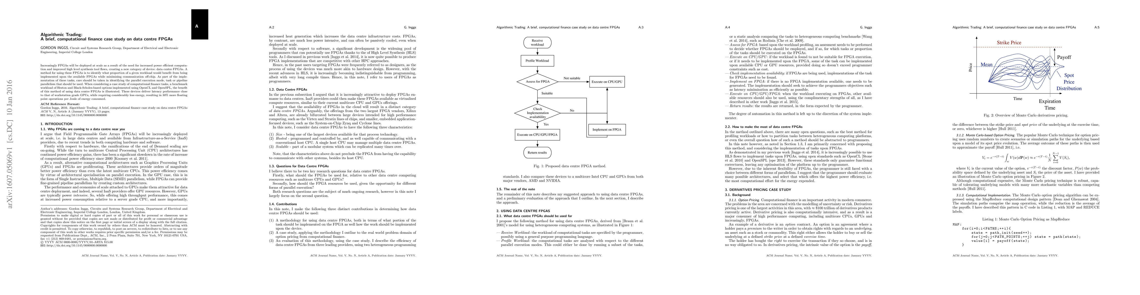 Increasingly FPGAs will be deployed at scale due to the need for increased need for power efficient computation and improved high level synthesis tool flows, creating a new category of device: data centre FPGAs. A method for using these FPGAs is to identify what proportion of a given workload would benefit from being implemented upon the available FPGAs while minimising communication off-chip. As part of the implementation of these tasks, care should be taken in identifying the parallel execution mode, task or pipeline parallelism that should be used. When considering a case study of computational finance tasks, a benchmark workload of Heston and Black-Scholes-based options implemented using OpenCL and OpenSPL, the benefit of this method of using data centre FPGAs is illustrated. These devices deliver latency performance close to that of workstation grade GPUs, while requiring considerably less energy, resulting in 30% more floating point operations per Joule of energy consumed.