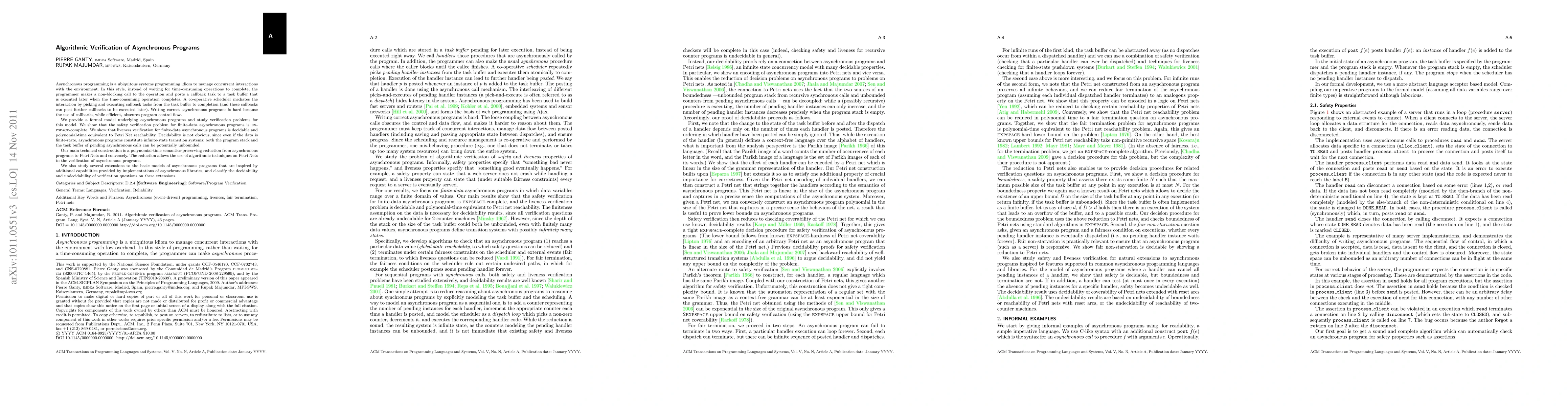 This paper develops a formal model for verifying asynchronous programs, showing that safety verification is expspace-complete while liveness verification is decidable and polynomial-time equivalent to Petri Net reachability. It employs a polynomial-time reduction from asynchronous programs to Petri Nets for verification purposes.