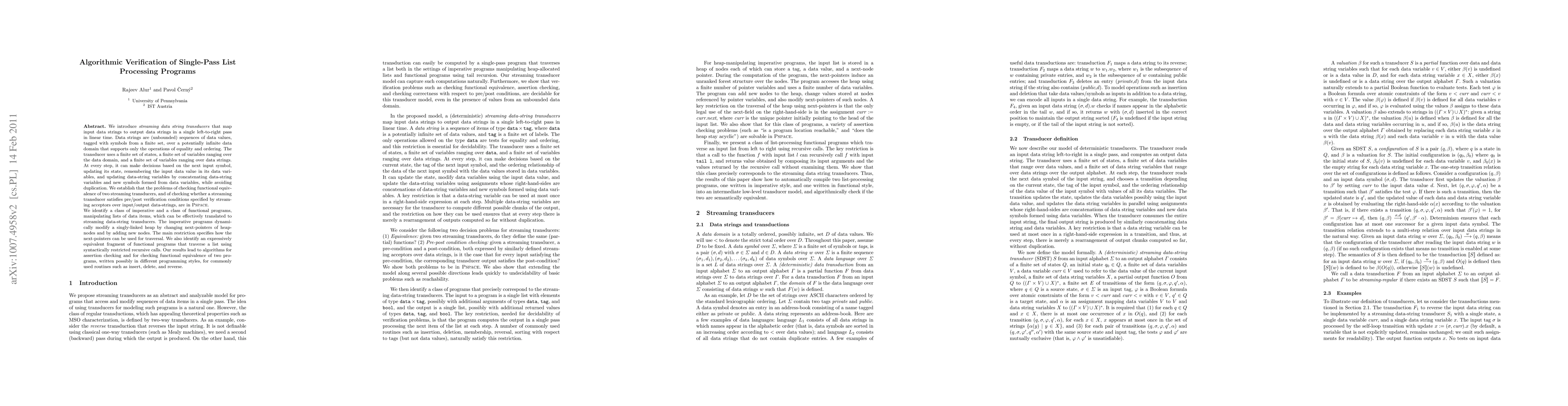 Researchers developed streaming data string transducers that verify single-pass list processing programs in linear time, enabling efficient assertion checking and functional equivalence checks for common routines like insert, delete, and reverse.