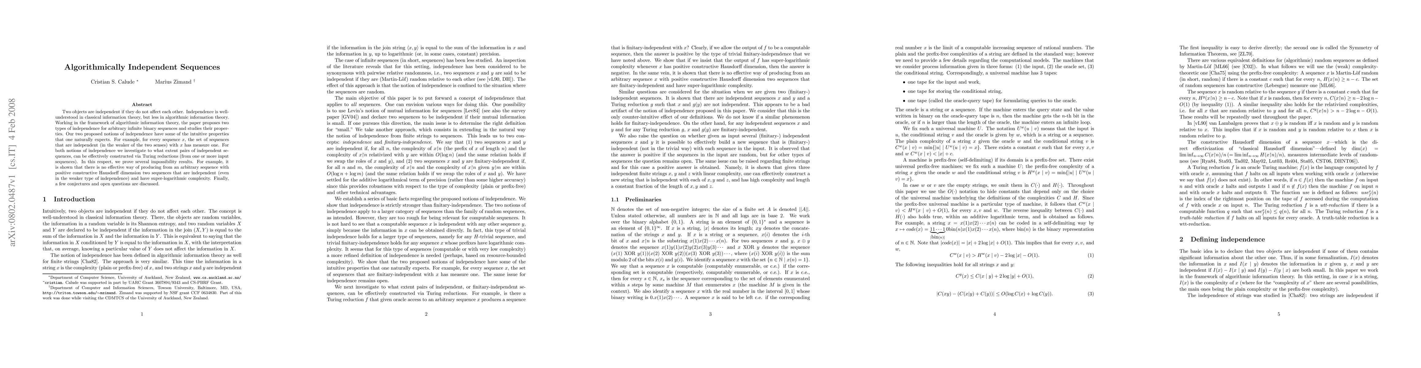 This paper introduces two types of algorithmic independence for infinite binary sequences in the context of algorithmic information theory, explores their properties, and demonstrates impossibility results regarding their effective construction via Turing reductions. It also discusses several conjectures and open questions.