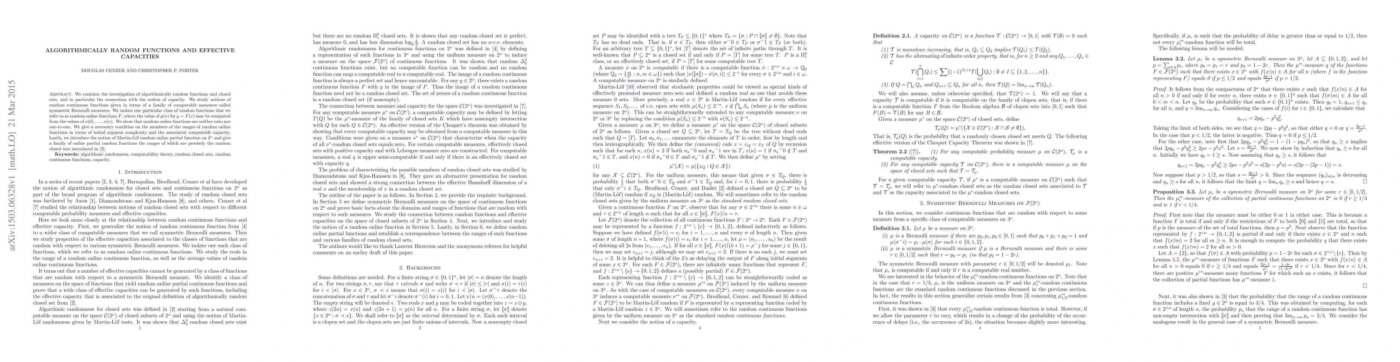 We continue the investigation of algorithmically random functions and closed sets, and in particular the connection with the notion of capacity. We study notions of random continuous functions given in terms of a family of computable measures called symmetric Bernoulli measures. We isolate one particular class of random functions that we refer to as online random functions $F$, where the value of $y(n)$ for $y = F(x)$ may be computed from the values of $x(0),\dots,x(n)$. We show that random online functions are neither onto nor one-to-one. We give a necessary condition on the members of the ranges of online random functions in terms of initial segment complexity and the associated computable capacity. Lastly, we introduce the notion of online \emph{partial} Martin-L\"of random function on $2^\omega$ and give a family of online partial random functions the ranges of which are precisely the random closed sets introduced by Barmpalias, Brodhead, Cenzer, Dashti, and Weber.