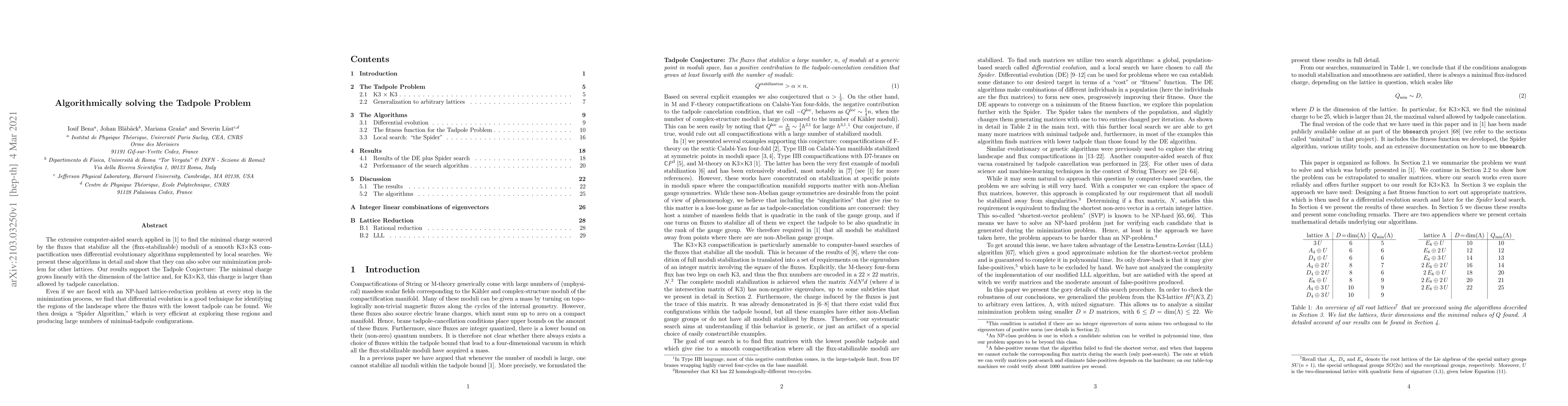 The extensive computer-aided search applied in [arXiv:2010.10519] to find the minimal charge sourced by the fluxes that stabilize all the (flux-stabilizable) moduli of a smooth K3xK3 compactification uses differential evolutionary algorithms supplemented by local searches. We present these algorithms in detail and show that they can also solve our minimization problem for other lattices. Our results support the Tadpole Conjecture: The minimal charge grows linearly with the dimension of the lattice and, for K3xK3, this charge is larger than allowed by tadpole cancelation. Even if we are faced with an NP-hard lattice-reduction problem at every step in the minimization process, we find that differential evolution is a good technique for identifying the regions of the landscape where the fluxes with the lowest tadpole can be found. We then design a "Spider Algorithm," which is very efficient at exploring these regions and producing large numbers of minimal-tadpole configurations.