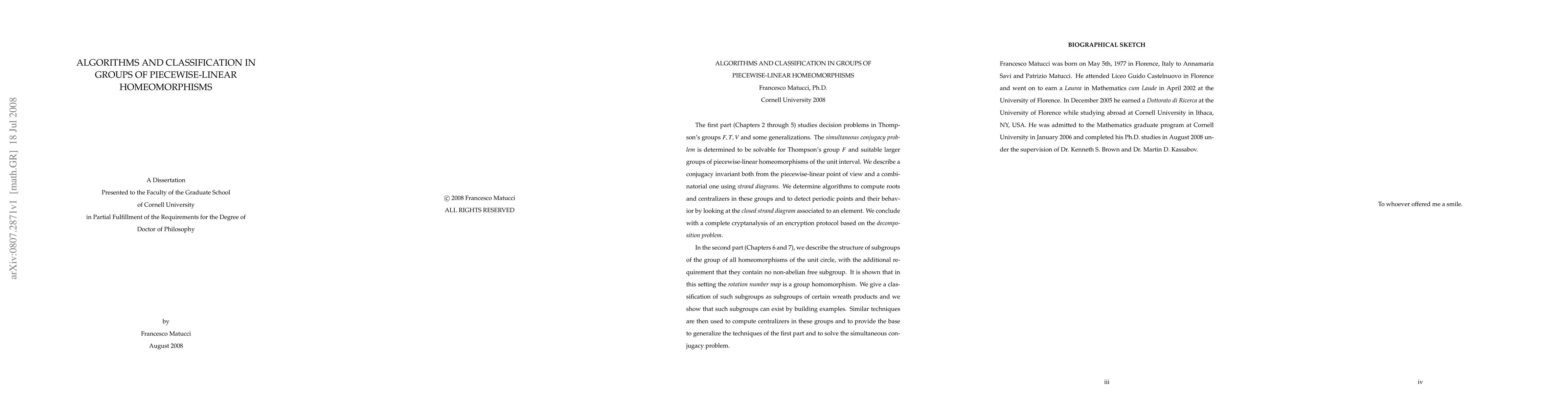 This paper explores algorithms and classification in groups of piecewise-linear homeomorphisms, determining solvable conjugacy problems and computing roots and centralizers in Thompson’s groups F and larger related groups. It also classifies subgroups of homeomorphisms of the unit circle that contain no non-abelian free subgroups, showing the rotation number map is a group homomorphism.
