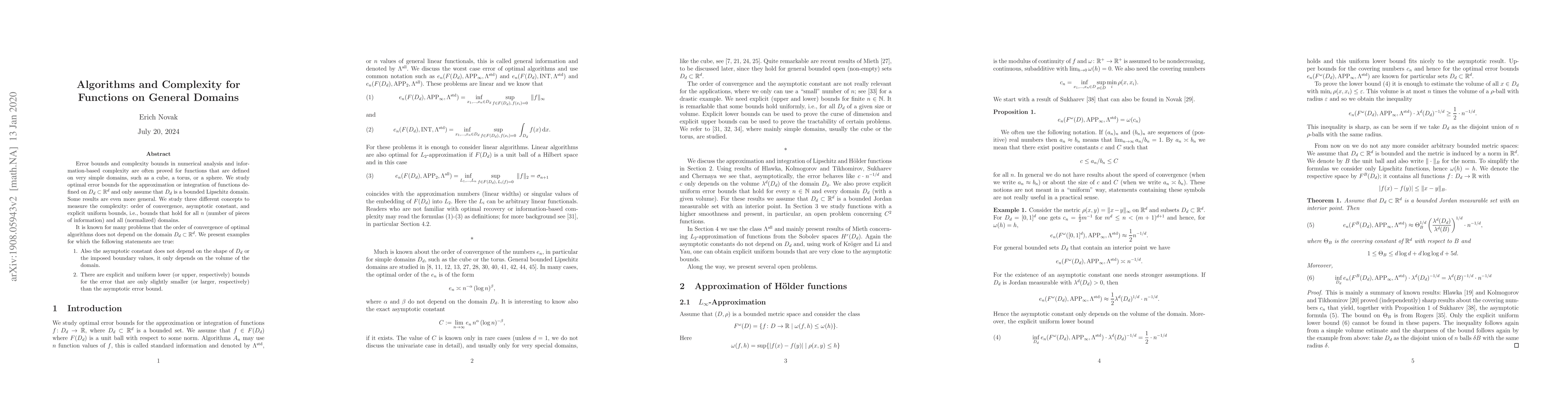This research explores algorithms and complexity for functions on general domains, proving optimal error bounds for approximation or integration of functions on bounded Lipschitz domains. Key findings include that convergence order and asymptotic constants for many problems remain domain-independent, depending only on volume. Explicit uniform bounds on error are shown to be nearly as tight as asymptotic bounds, irrespective of domain shape or boundary conditions.