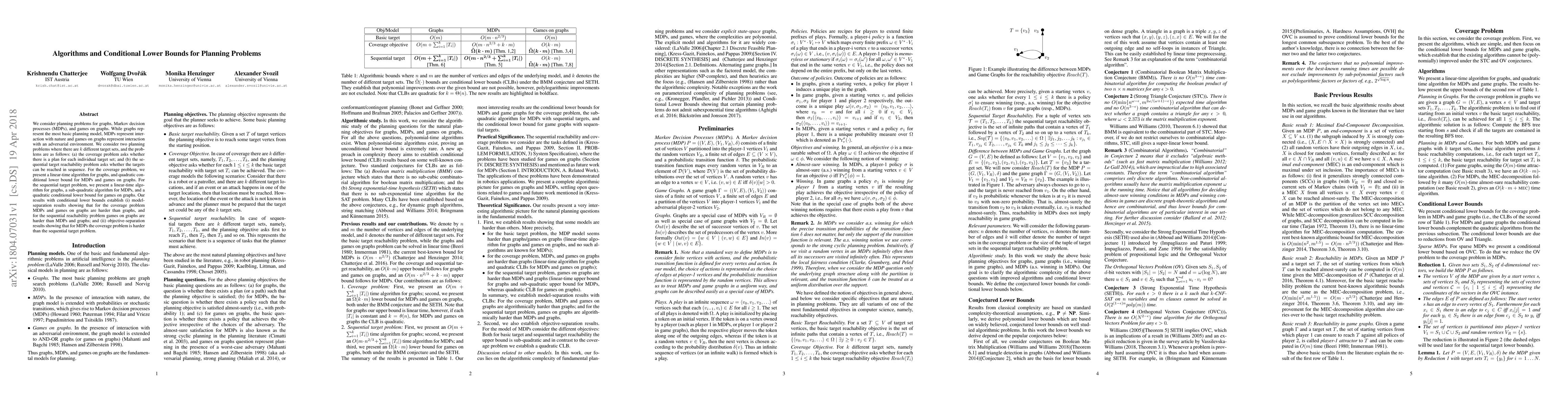 This paper presents algorithms and conditional lower bounds for planning problems in graphs, Markov decision processes (MDPs), and games on graphs. It introduces linear-time algorithms for graph-based coverage and sequential target problems, while establishing conditional lower bounds that demonstrate model- and objective-separation results.